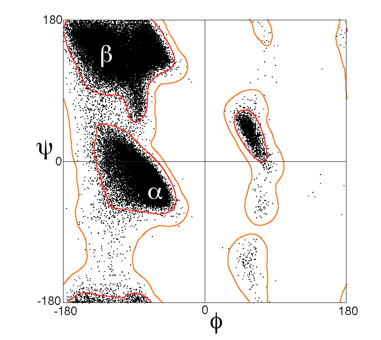 β-가닥은 거의 완벽하게 펴지지 않으며, 오히려 비틀림을 나타낸다. 에너지적으로 선호되는 이면각은 (''φ'', ''ψ'') = (–135°, 135°) 근처이며, (넓게는, 라마찬드란 플롯의 왼쪽 위 영역) 완전히 펴진 컨포메이션 (''φ'', ''ψ'') = (–180°, 180°)과 크게 다르다.[1]