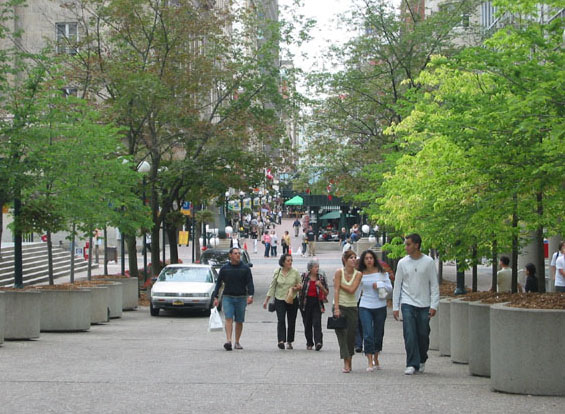보행자 전용화는 1950년대와 60년대 미국에서도 흔하게 나타났는데, 이는 도심의 상업 시설들이 새로운 교외 쇼핑몰과 경쟁하려 했기 때문이다. 그러나 이러한 계획의 대부분은 장기적으로 성공하지 못했고, 약 90%가 다시 자동차 통행 구역으로 변경되었다.[7]
