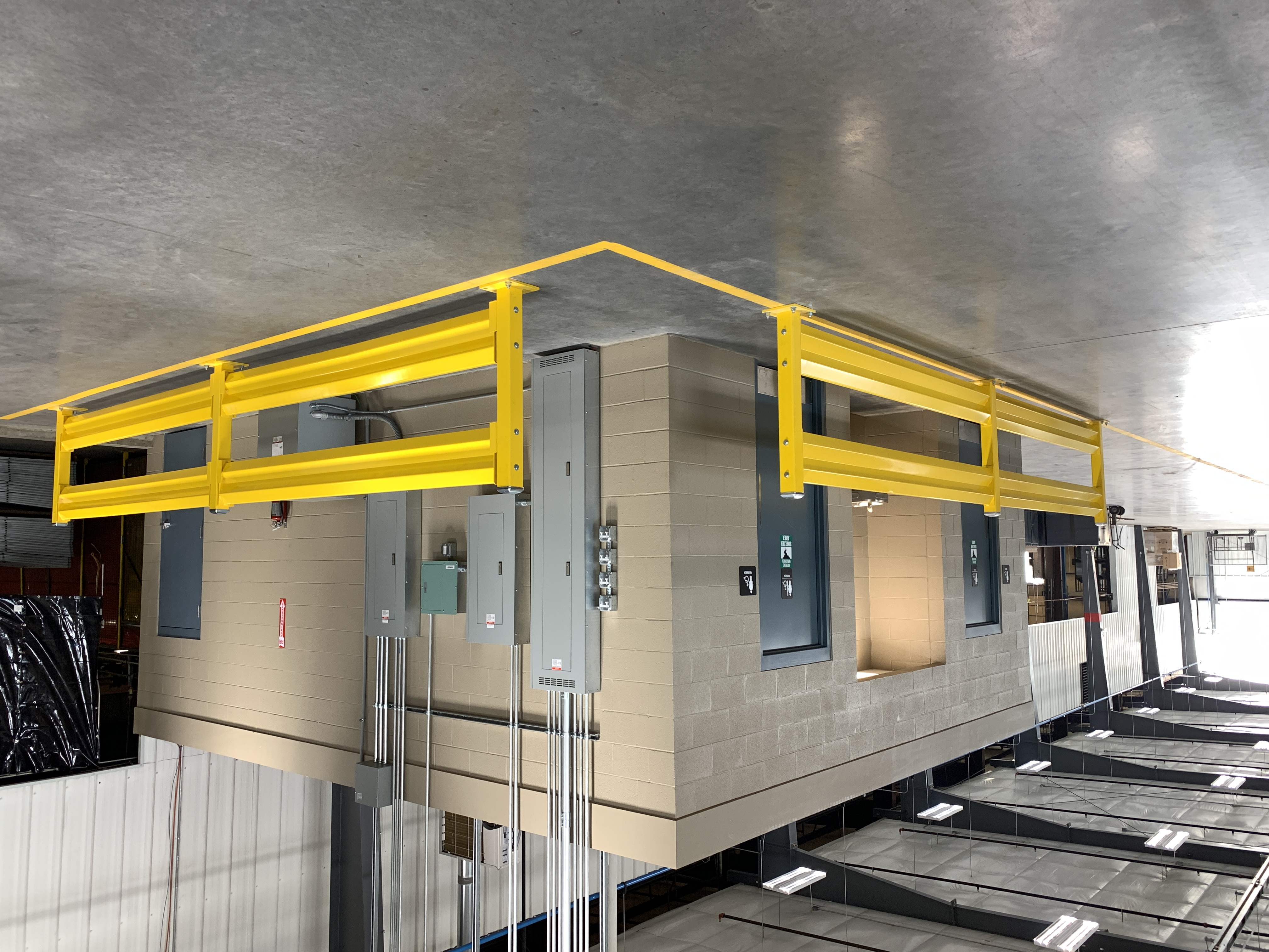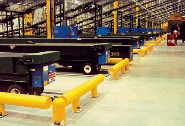 산업 및 유통 시설에서 '보호 난간'은 주로 바닥에 설치된 수직 기둥에 수평 레일을 부착한 형태를 의미하며, 이는 도로의 보호 난간과 유사한 모습이다. 시설 내 안전 보호 난간은 공장 내 차량 통행을 관리하고, 차량의 부주의한 접촉으로 인해 재산이나 인명 피해가 발생할 수 있는 구역을 보호하는 역할을 한다.[8] 보호 난간은 주로 통로나 건물 벽을 따라 설치되며, 지게차 등의 실수로 인한 충돌로부터 장비 설치 구역을 보호하기 위해 주변에 배치되기도 한다. 즉, 보호 난간은 지게차나 기타 공장 내 차량이 장비, 건물 벽 또는 사람에게 접근하는 것을 막는 안전 장벽 역할을 수행한다.