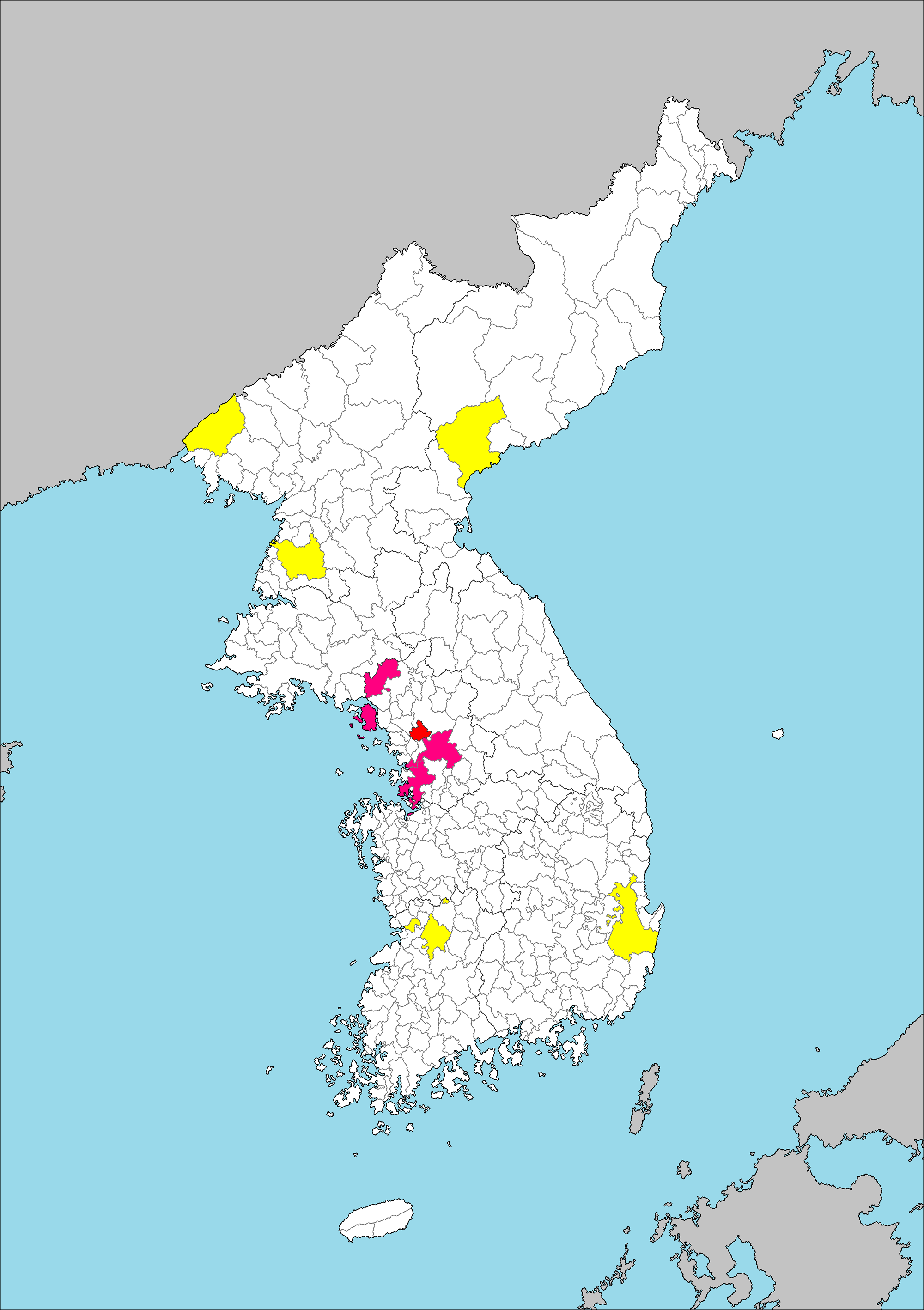 1896년 | 13도제 시행. 한성부, 광주부, 개성부, 강화부 부활. 개항장 인천부(제물포항), 동래부(부산항), 덕원부(원산항), 경흥부(조선-러시아 국경) 신설. |