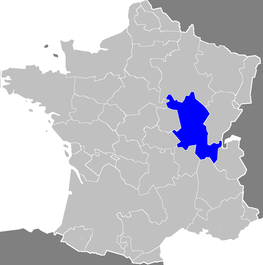- 부르고뉴: 코트도르, 손에루아르, 그리고 욘의 남쪽 절반. 이는 옛 부르고뉴 공작 공국(나중에 '부르고뉴 지방'으로 불림)에 해당한다. 그러나 옛 부르고뉴 백국(나중에 '프랑슈콩테 지방'으로 불림)은 부르고뉴 지역에 포함되지 않고, 프랑슈콩테 지역을 구성한다. 또한, 부르고뉴 공국(부르고뉴 지방)의 작은 부분은 현재 샹파뉴아르덴 지역 안에 있다.