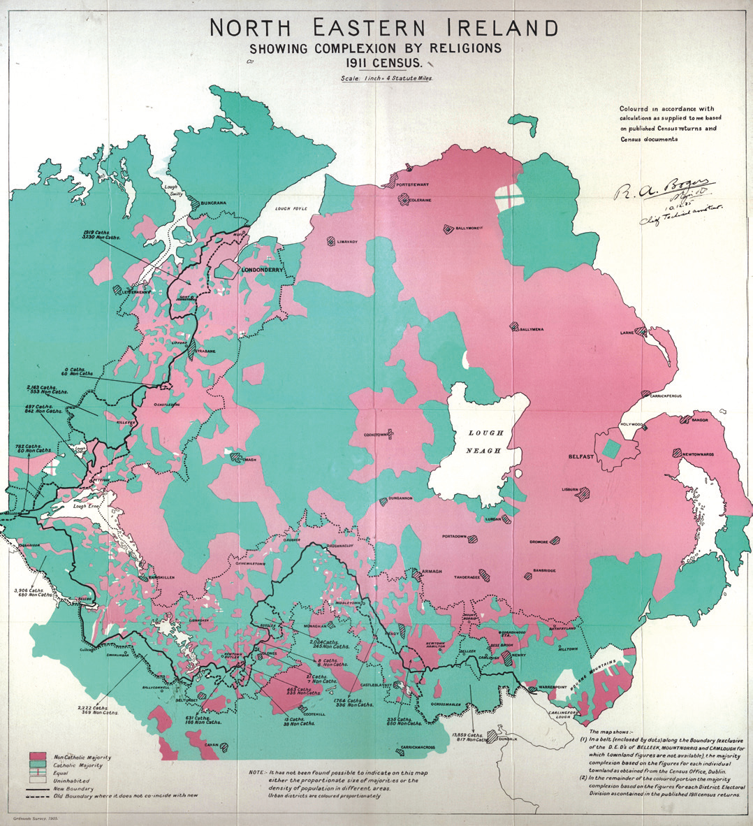 1916년 부활절 봉기 이후, 신 페인은 1918년 총선에서 승리했고, 아일랜드 독립 전쟁이 이어졌다. 1922년 아일랜드 자유국이 독립했지만, 얼스터, 특히 북아일랜드는 연합주의자들이 다수였다.[78]