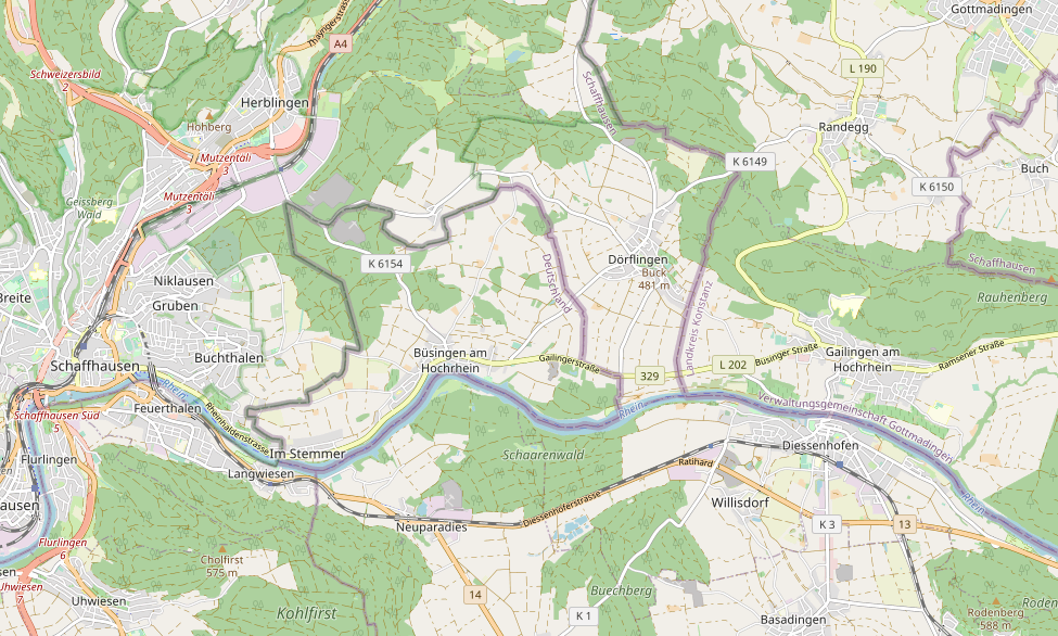 스위스와의 국경 길이는 17.141km이며, 123개의 경계석으로 표시되어 있다.[13] 이 중 '하팅거 스톤(Hattinger Stone)'이라 불리는 돌은 뷔징겐-도르플링겐(Büsingen-Dörflingen) 경계를 나타내며, 다른 여러 경계 지점과 함께 라인강(Rhine)에 위치한다.[13]
