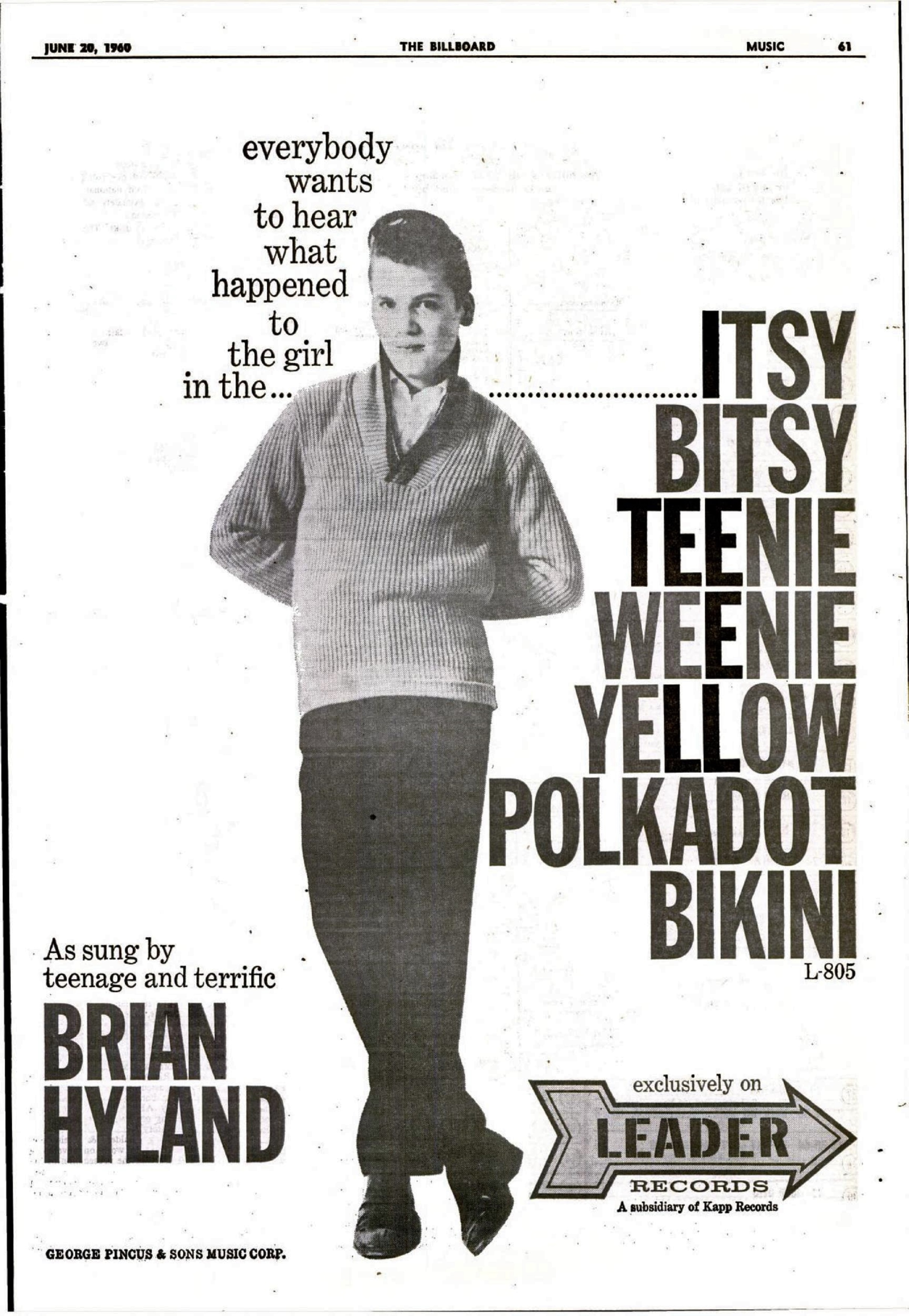1960년 8월, 16세의 하일랜드는 반스와 포크리스가 작곡한 "Itsy Bitsy Teenie Weenie Yellow Polka Dot Bikini"를 발표하여 큰 인기를 얻었다.[2] 이 코미디 노래는 빌보드 핫 100 차트에서 1위를 차지했으며(영국에서는 8위), 발매 후 두 달 만에 거의 백만 장, 총 2백만 장 이상 판매되었다.[3][4]