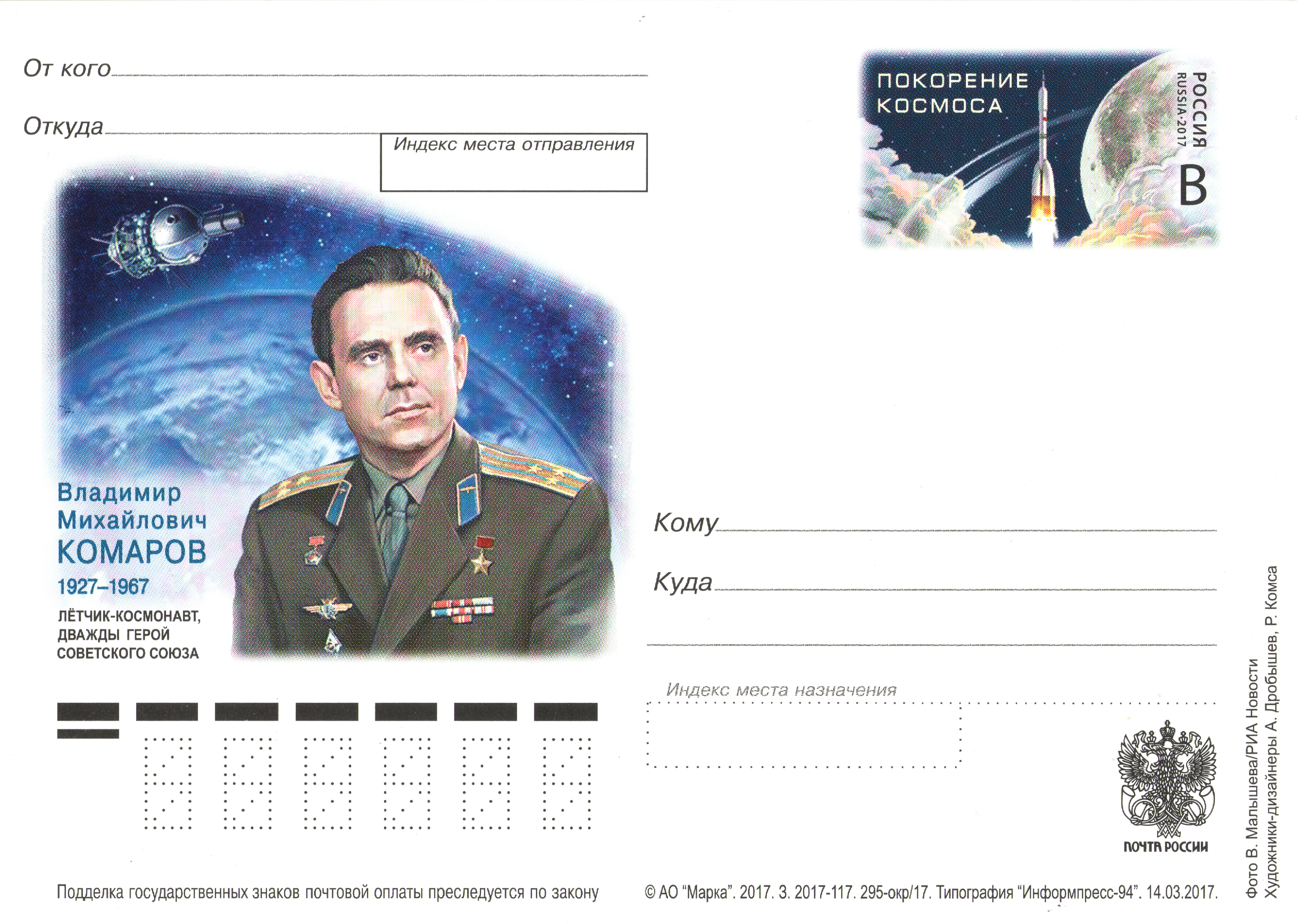 블라디미르 코마로프는 사후 레닌 훈장과 소련 영웅 칭호를 받았다.[34] 1967년 4월 26일, 모스크바에서 국장으로 장례가 치러졌고, 그의 유해는 붉은 광장의 크렘린 벽 묘지에 안치되었다.[33] 1968년 4월 25일, 오르스크 근처 추락 지점에서 코마로프를 위한 추모식이 거행되었으며, 카마닌은 일기에 10,000명이 넘는 사람들이 이 행사에 참석했다고 기록했다.[35]코마로프는 우주 프로그램에 기여한 공로를 기리기 위해 여러 국가에서 발행된 우표와 기념 최초 발행 봉투에 등장했다.[36] 모스크바의 '우주 비행사 거리'에는 그의 흉상이 설치되었으며, 오르스크 근처 추락 지점에도 기념비가 세워져 있다.[36]