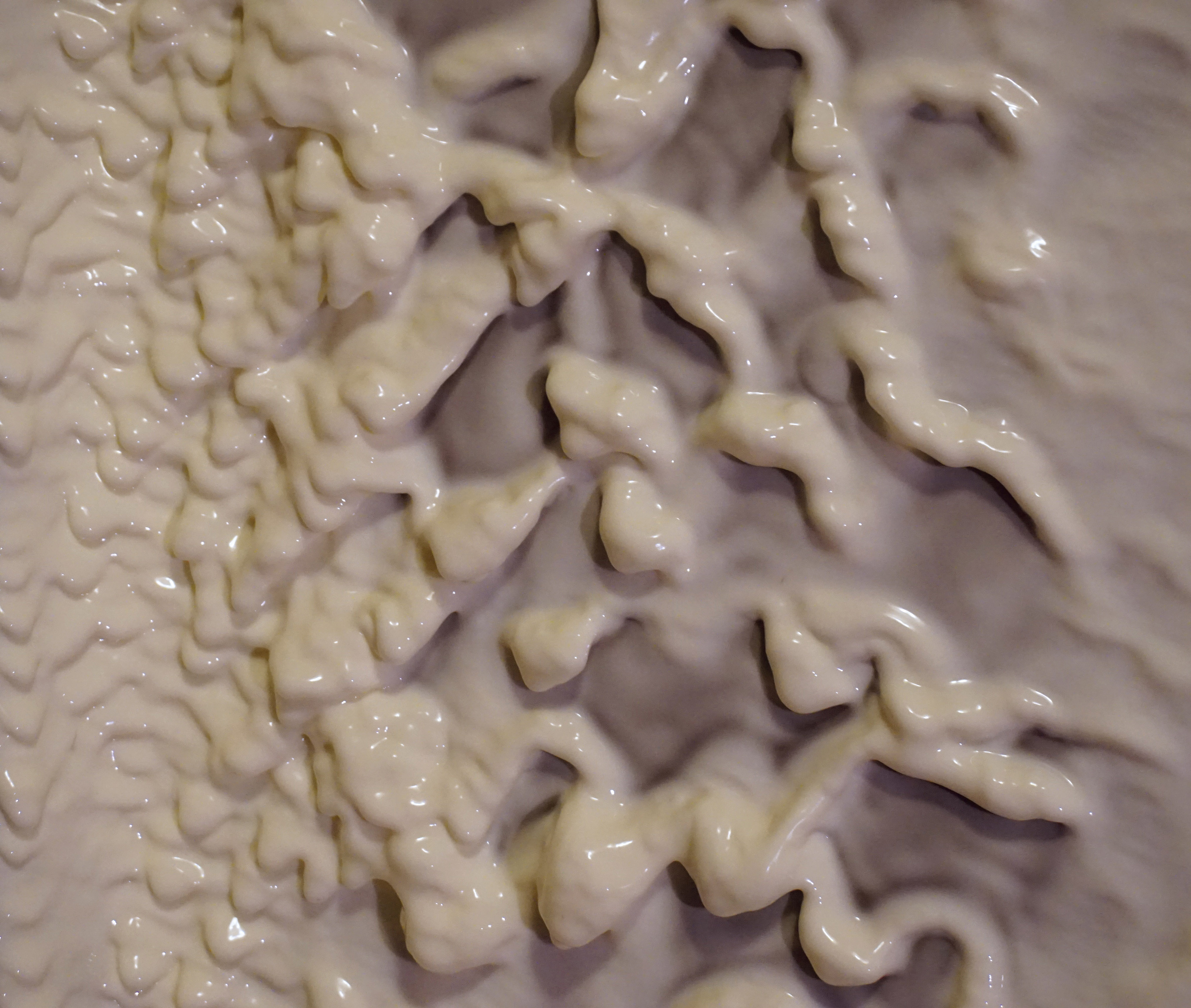 페인트는 비뉴턴 유체이다. 흰색 페인트로 덮인 평평한 표면이 수직으로 놓여 있다(사진을 찍기 전에 평평한 표면은 책상 위에 수평으로 놓여 있었다). 유체는 표면 아래로 떨어지기 시작하지만, 비뉴턴 성질 때문에 중력 가속도로 인해 응력을 받는다. 따라서 표면을 따라 미끄러지는 대신, 떨어지는 것이 제한된 매우 크고 매우 밀도가 높은 물방울을 형성한다.