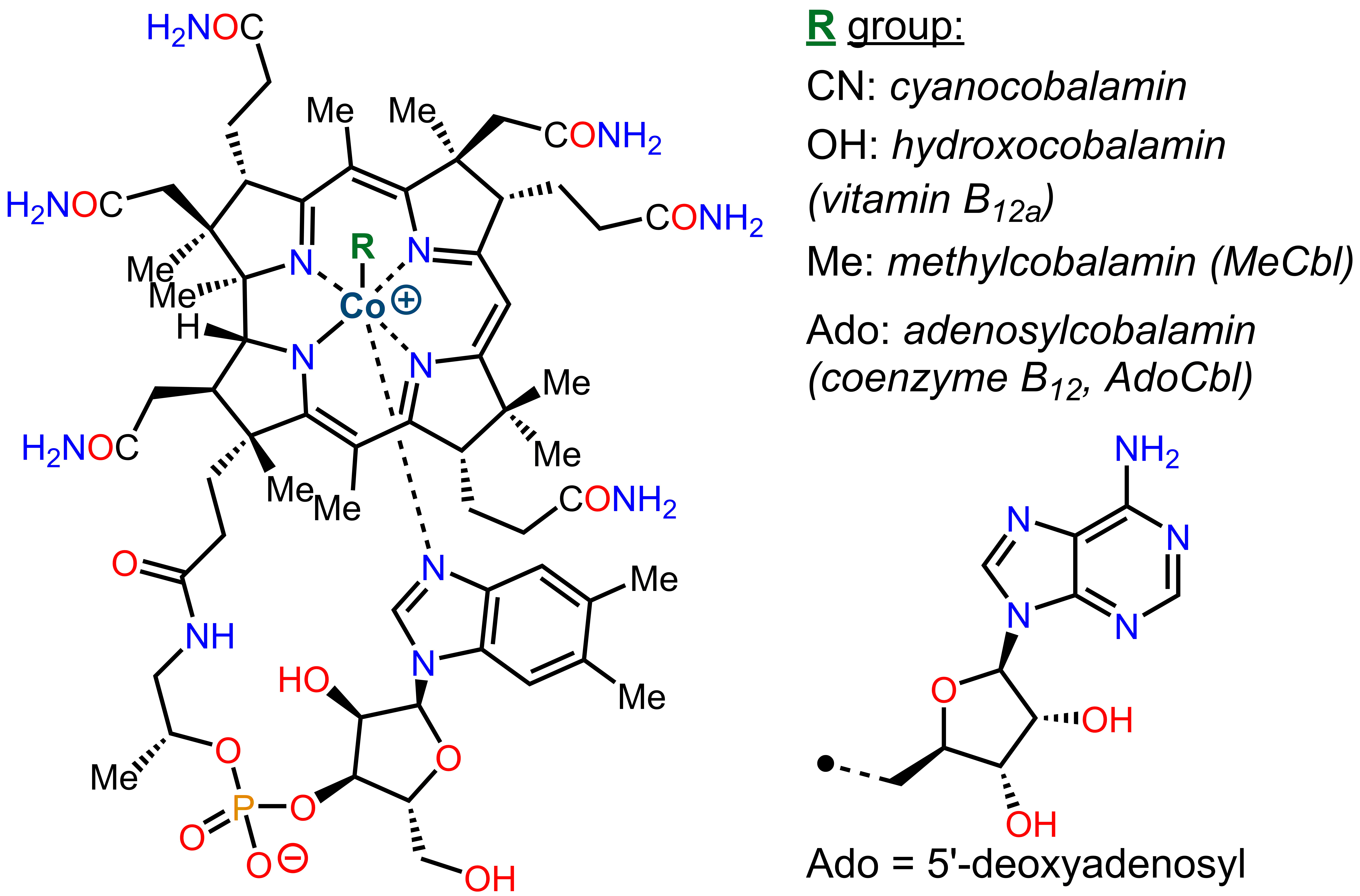 - 메틸코발라민: 아데노실 리간드가 메틸기로 대체된 형태이다.