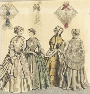 • '''소매''': 소매는 빅토리아 시대 초기에 꽉 끼는 형태였으나, 크리놀린이 유행하면서 스커트의 부피가 커지자 균형을 맞추기 위해 큰 벨 모양으로 변했다. '엥가장'은 레이스, 리넨 등으로 만들어진 탈부착 가능한 소매로, 팔꿈치 길이의 소매 아래에 덧대어 착용했다. 쉽게 세탁하고 다시 꿰맬 수 있어 실용적이었다.