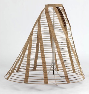 1856년에는 최초의 인공 케이지 크리놀린이 발명되면서 스커트는 더욱 극적으로 확장되어 돔(dome) 형태를 이루었다. 크리놀린의 목적은 허리를 가늘어 보이게 하고 엉덩이를 부풀려 인공적인 모래시계 실루엣을 만드는 것이었다. 케이지 크리놀린은 얇은 금속 띠를 연결하여 원형 구조를 만들어 스커트의 넓은 폭을 지지했다. 이는 철을 강철로 만들고 가느다란 와이어로 뽑아낼 수 있게 된 기술 발전 덕분이었다.[1] 크리놀린의 거대한 크기는 당시 언론과 만화가들의 조롱거리가 되기도 했지만, 이 혁신적인 발명품은 여성들을 여러 겹의 무거운 페티코트로부터 해방시켰고 위생적으로도 더 나은 선택이었다.[7]
