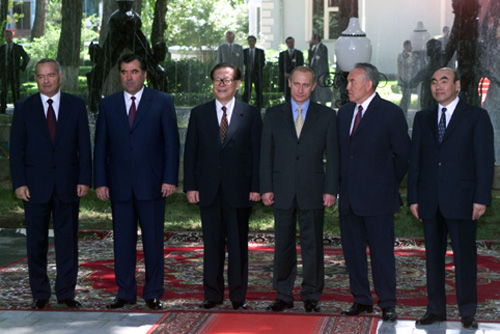 이러한 배경 속에서 1996년 4월 26일 상하이에서 '''상하이 5개국'''[148]이 결성되었고, 이것이 SCO의 전신이 되었다.[149] 2000년 상하이 5개국 회의에 우즈베키스탄이 참가했고, 2001년 6월 15일 SCO가 발족했다.