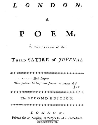 1737년, 존슨은 런던으로 가서 비극을 쓰거나 신문에 기고했다.[257] 에드워드 케이브의 『신사 잡지(The Gentleman's Magazine)』에 글을 기고하며 생계를 유지했다. 1738년, 첫 번째 주요 작품인 시 『런던(London)』을 익명으로 출판했다.[257]