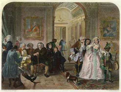 체스터필드 경의 대기실에 있는 존슨 박사. E.M. 워드의 채색 판화.
