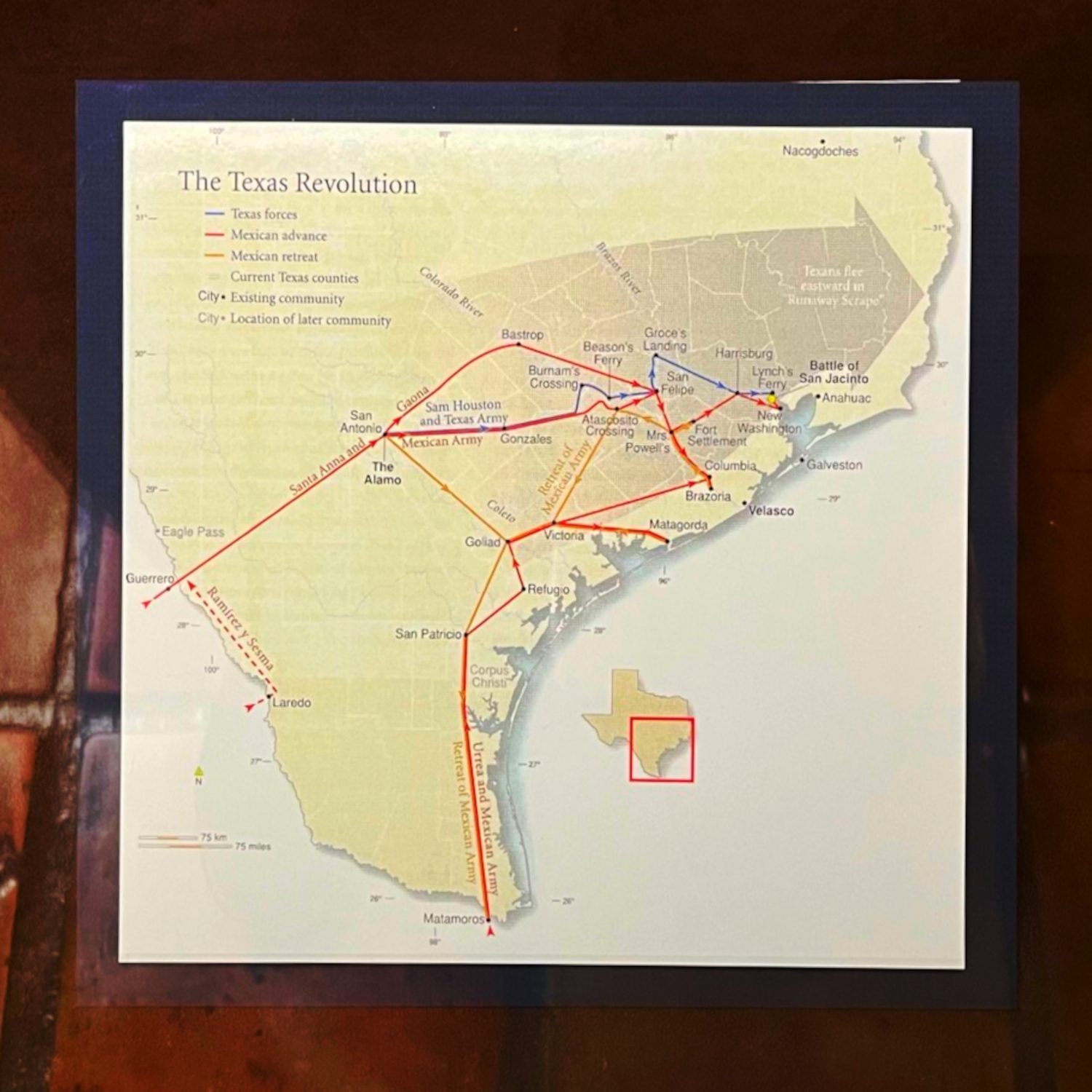 그러나 텍사스 군은 알라모 전투와 골리아드 작전에서 큰 피해를 입었다. 최고 사령관 샘 휴스턴은 알라모 함락 소식을 듣고 Gonzales|곤잘레스영어를 불태우고 동쪽으로 후퇴했다. 산타 안나 대통령이 이끄는 멕시코군은 텍사스 군을 추격했고, 멕시코에 대한 증오와 휴스턴에 대한 불만 속에서도 텍사스군은 멕시코군을 피해 계속 후퇴해야 했다.[42]