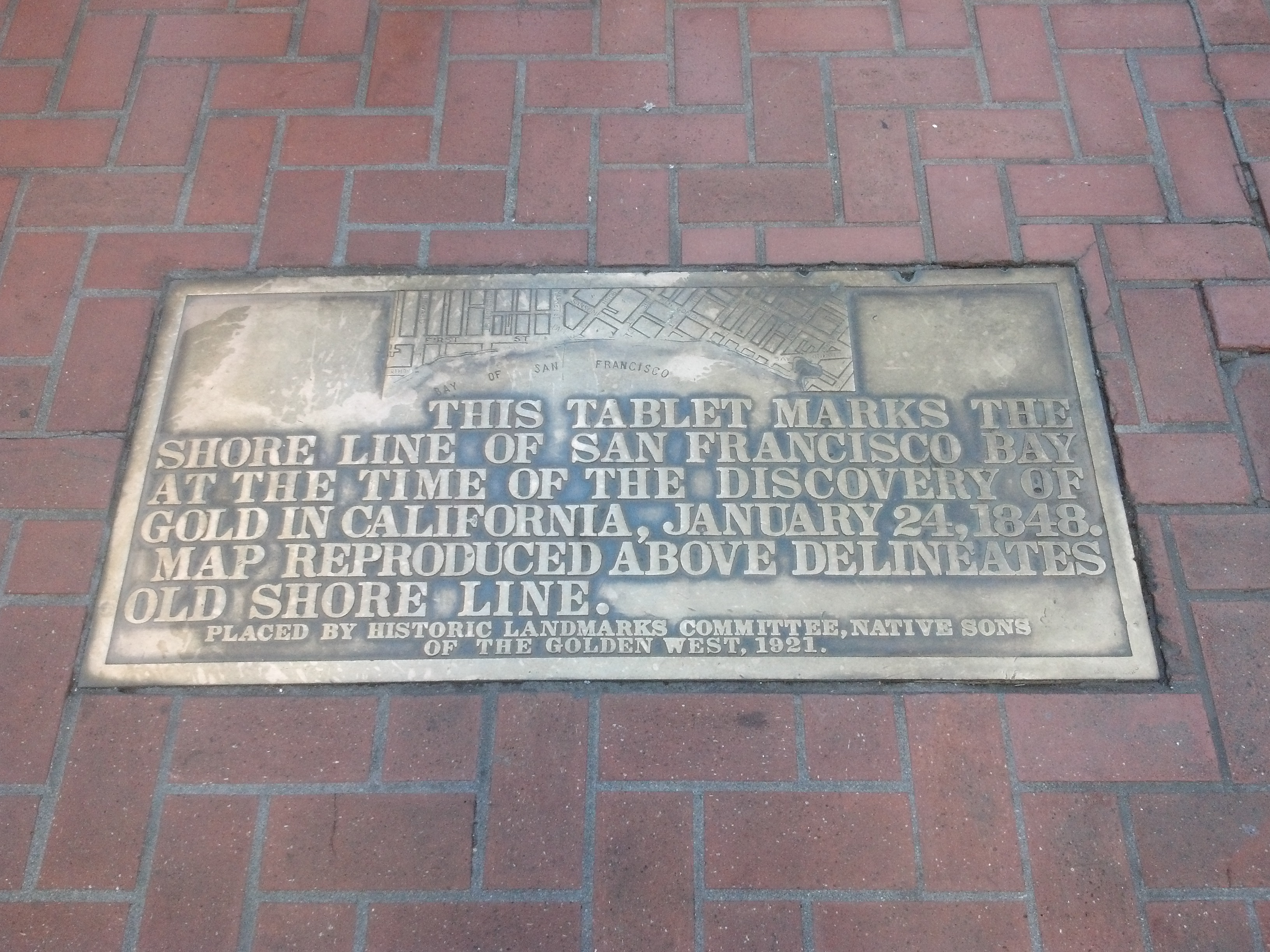 1921년, 샌프란시스코 시내의 한 무리의 사람들이 1848년 1월 24일 캘리포니아에서 금이 발견되었을 당시 샌프란시스코 만의 해안선을 표시하는 기념비를 헌정했다. 기념비에는 "위에 재현된 지도는 옛 해안선을 보여준다. 1921년, 역사적인 랜드마크 위원회와 골든 웨스트 원주민(Native Sons of the Golden West)에서 설치."라는 문구가 새겨져 있다.[17]