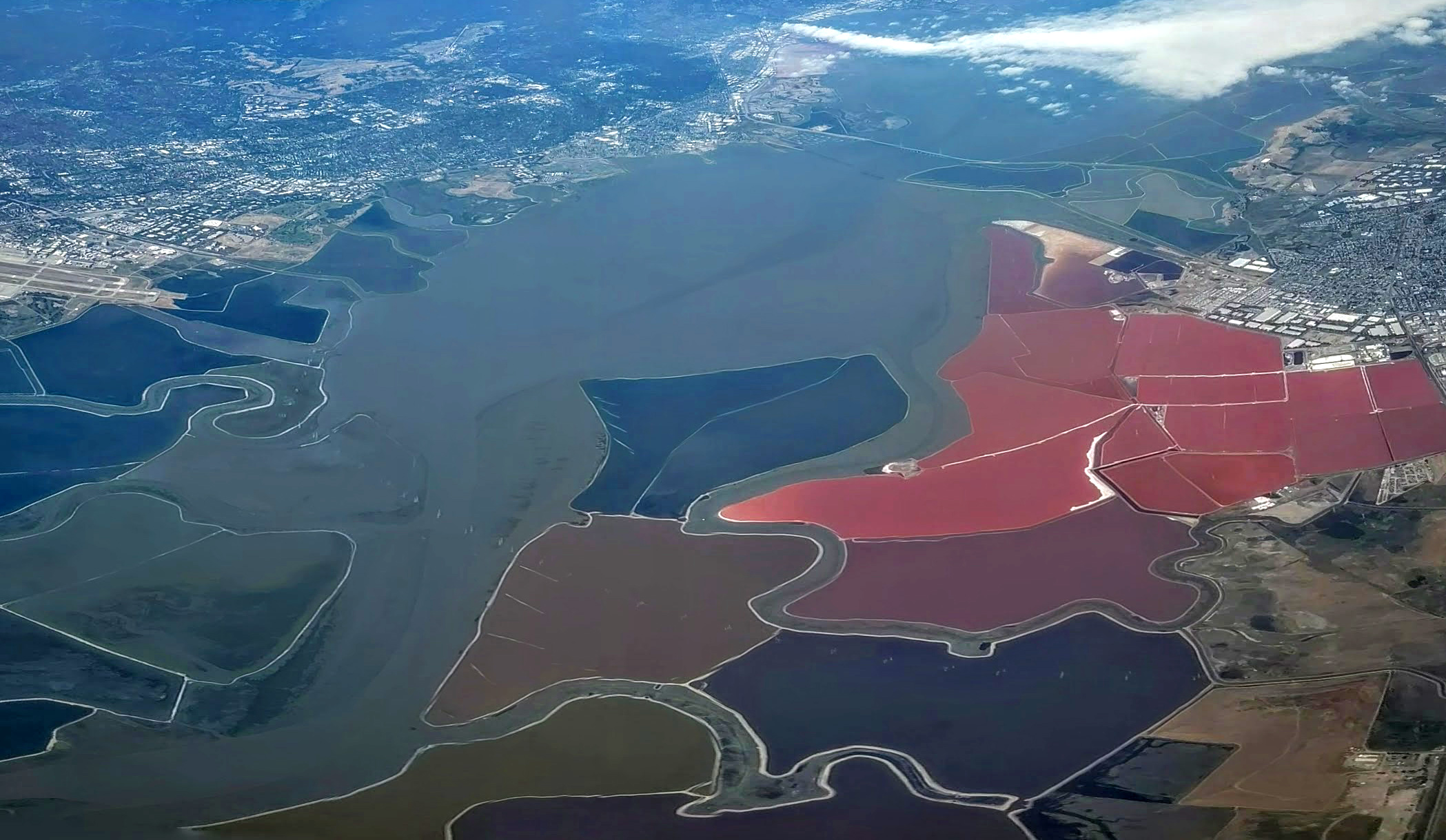 낮은 염도의 염전은 풍부한 물고기와 물고기를 먹는 새와 함께 만의 생태계를 반영한다. 중간 염도의 연못은 수백만 마리의 도요새에게 풍부한 먹이를 제공하는 브라인 쉬림프의 밀집된 개체군을 지원한다. 고염도 연못에서는 염분에 강한 미세 조류만이 생존하며, 조류의 원형질 내 색소로 인해 이 연못에 짙은 붉은색을 부여한다. 염생습지 수확쥐는 염분 내성이 높고 샌프란시스코만 습지에 고유한 멸종 위기종이다. 서식지에는 침입성 해초에 의해 종종 대체되는 토종 피클위드가 필요하다.[34]