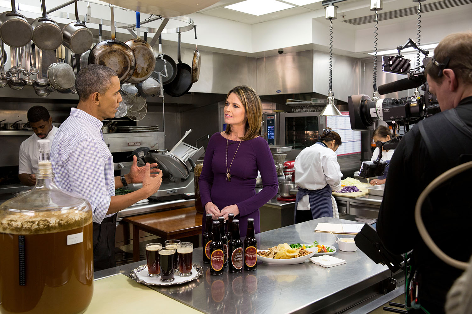 거스리가 슈퍼볼 XLIX 프리 게임 쇼를 위해 버락 오바마와 백악관 주방에서 인터뷰를 진행하고 있다.