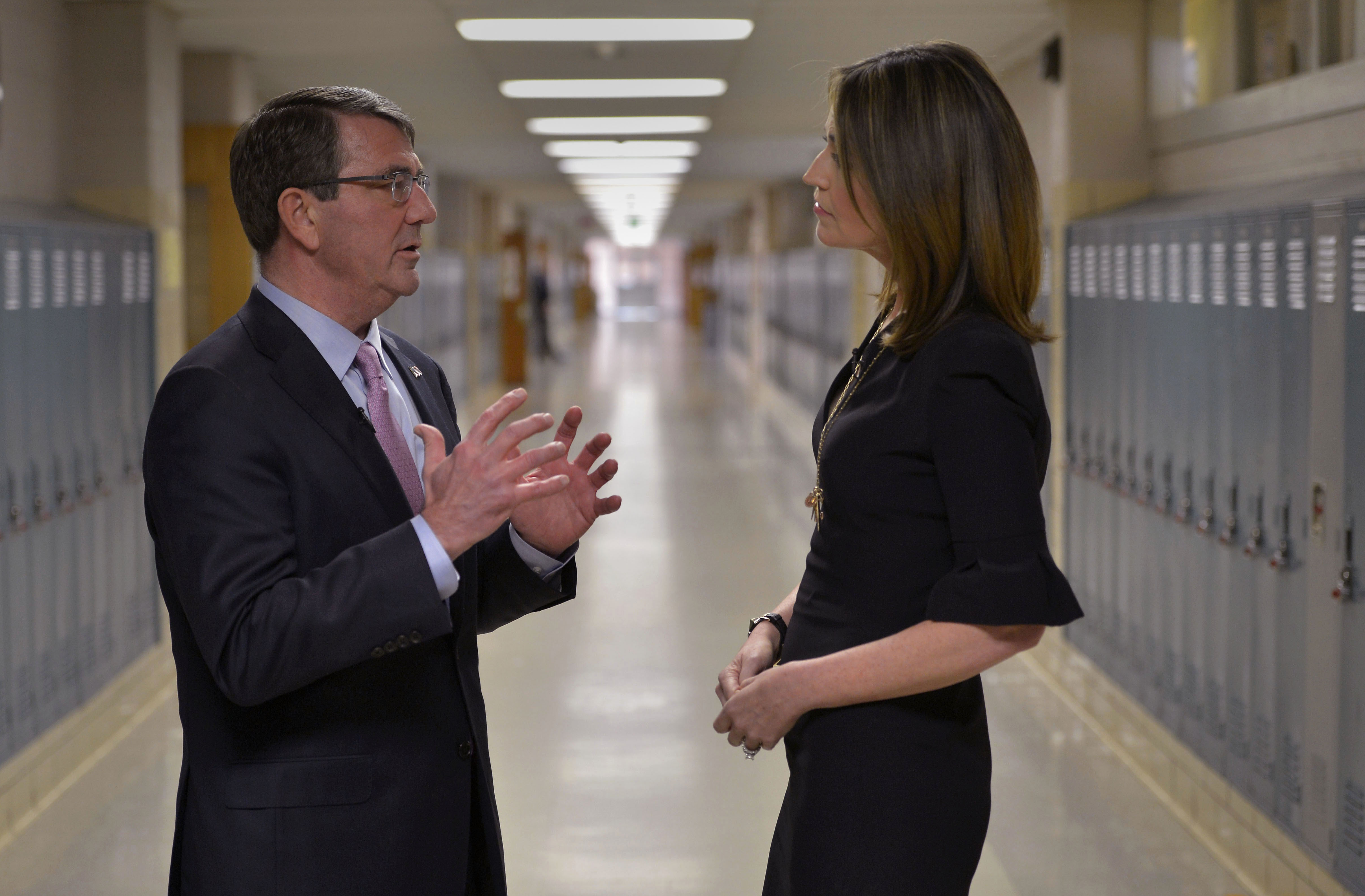 거스리가 2015년 3월 미국 국방부 장관 애슈턴 카터와 인터뷰를 진행하고 있다.