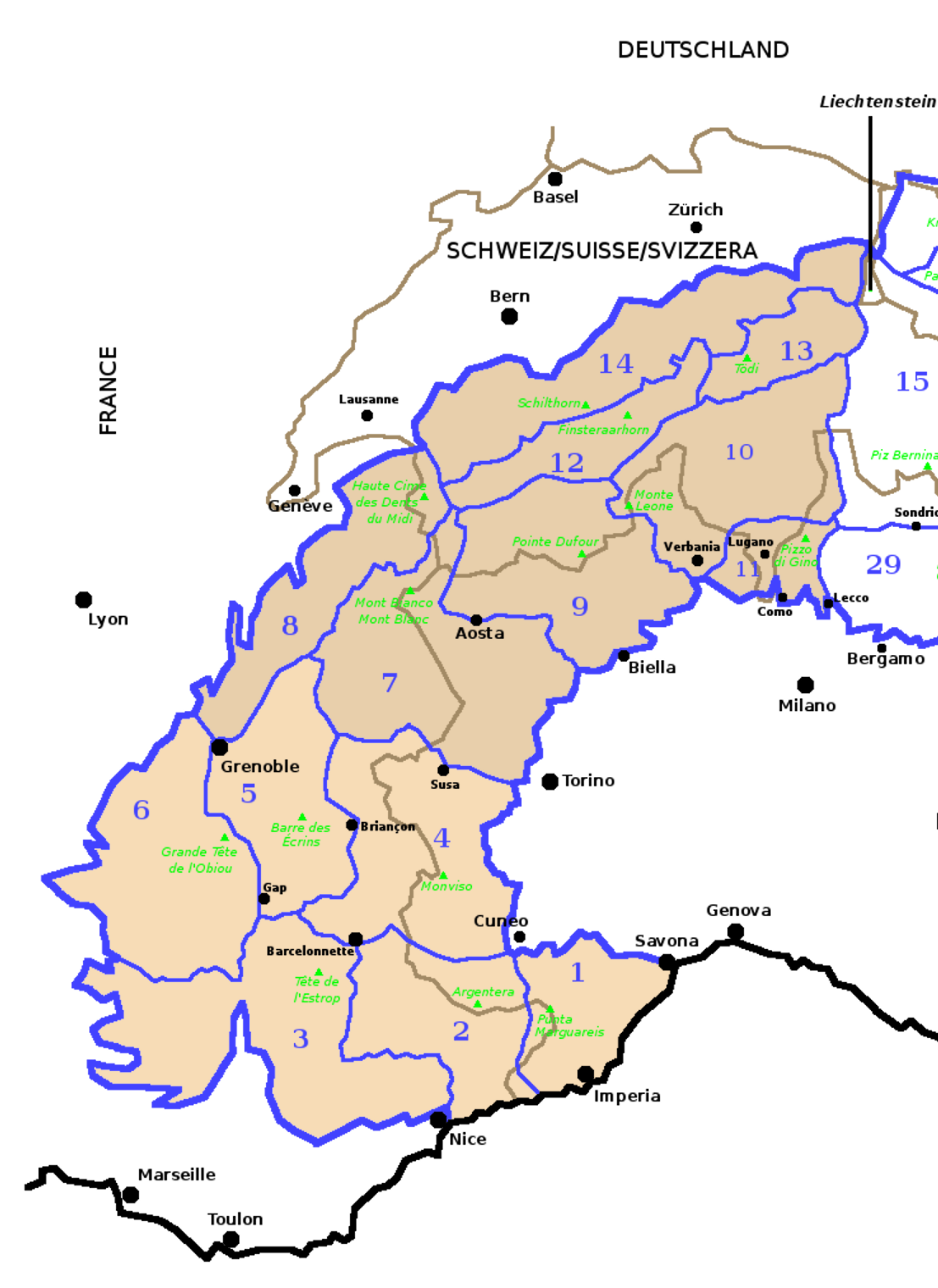 ''Partizione delle Alpi''는 서알프스산맥을 다음 8개 구역으로 나눈다(괄호 안은 구역 번호):