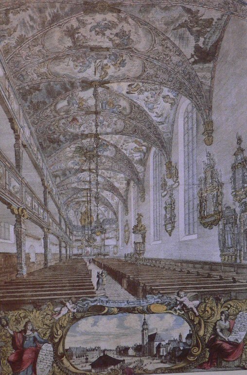 성 카탈리나 교회는 멜키오르 헤슬러에 의해 1678년에서 1681년 사이에 바로크 건축 양식으로 지어졌으며, 높이는 54m이다. 건물의 외관은 소박하게 유지되었지만, 내부는 화려한 바로크 양식으로 장식되었다. 서쪽, 북쪽, 동쪽의 세 면에는 이중 갤러리가 있었다. 갤러리에는 일련의 그림들이 공간을 지배했다. 하단에는 41개의 그림이 있었는데, 각 그림은 구약성경의 각 책과 신약성경의 여러 책에서 따온 성경 장면을 묘사했다. 상단에는 성경 또는 알레고리와 일치하는 주제의 42개의 그림이 있었다. 제단은 늘 그렇듯이 동쪽에 설치되었지만, 설교단은 남쪽 벽에 있었다. 천장의 나무 구조는 후기 고딕 시대의 늑골 볼트를 연상시켰다. 이 천장에는 제2차 세계 대전 이후 복원되지 않은 성경 장면 그림이 있었다.