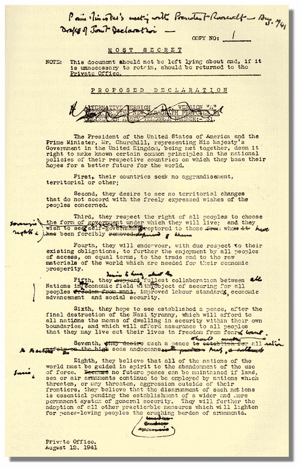 대서양 헌장은 영국과 미국이 합의한 발표문으로, 제2차 세계 대전 이후의 세계를 위한 청사진이었다.[37] 관세 및 무역에 관한 일반 협정(GATT), 전후 영국과 프랑스령의 독립 등이 대서양 헌장에서 파생되었다. "대서양 헌장"이라는 이름은 신문에서 만들어낸 제목이었으나, 윈스턴 처칠이 사용하면서 공식 명칭이 되었다.