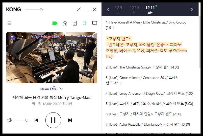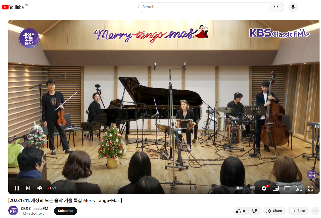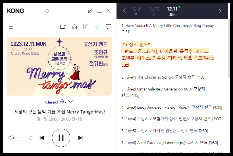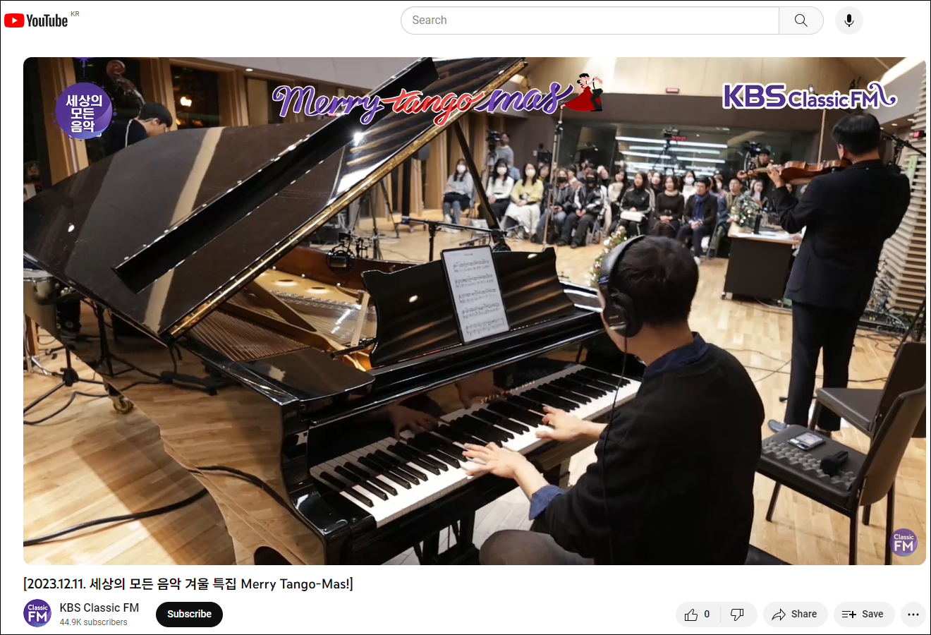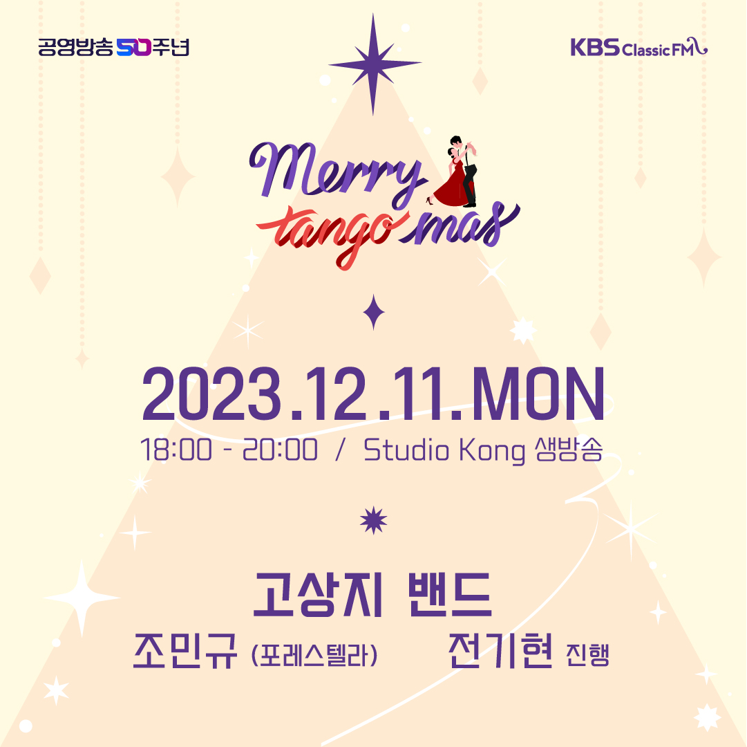 크리스마스 특집, 메리탱고마스 | 2023. 12. 11 (월) | 2012년 10주년 기념 첫 공개방송 이후, 두 번째로 기획한 공개 라이브이다. 클래식FM 유튜브채널로 실시간 방송했으며, 방청객 약 30명을 추첨해서 스튜디오로 초대했다. |