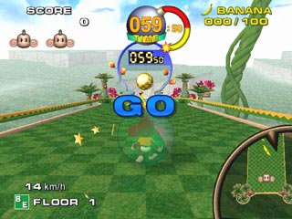 Marble Madness와 Labyrinth를 연상시키는 메인 게임의 목표는 4명의 플레이 가능한 원숭이 (아이아이, 미미, 베이비, 곤곤) 중 하나를 투명한 공 안에 가두어 매달린 일련의 플랫폼을 통과하고 골 지점까지 인도하는 것이다.[49][50][5] 플레이어는 아날로그 스틱을 움직여 '플로어'라고 불리는 레벨을 구성하는 플랫폼 전체를 기울이면 공이 그에 따라 굴러간다.[49][50][6] 공이 플로어에서 떨어지거나(이를 '폴 아웃'이라고 함) 게임 내 타이머가 0에 도달하면 플레이어는 세 개의 생명 중 하나를 잃는다.[5] 공이 움직이는 속도 (시속 마일 단위)가 화면 구석에 표시된다.[7] 게임을 일시 중지하고 "스테이지 보기" 옵션을 선택하면 카메라를 회전하여 플로어를 조사할 수 있다.[8] 플로어의 목표 지점에 도달하면 리플레이가 제공되며, 리플레이는 메모리 카드에 저장하여 원하는 대로 볼 수 있다.[9] 플로어 완료 시 남은 시간의 매 초마다 플레이어의 점수에 100점이 추가된다. 게임 전체에서 발견되는 수집 가능한 바나나도 100점의 가치가 있으며, 플로어를 할당된 시간의 절반 이내에 완료하거나 워프 게이트를 통해 완료하면 플레이어의 점수를 2배 또는 4배로 증가시키는 배수가 활성화된다.[49][45] 플레이어는 바나나 100개를 수집할 때마다 추가 생명을 얻는다.[10]