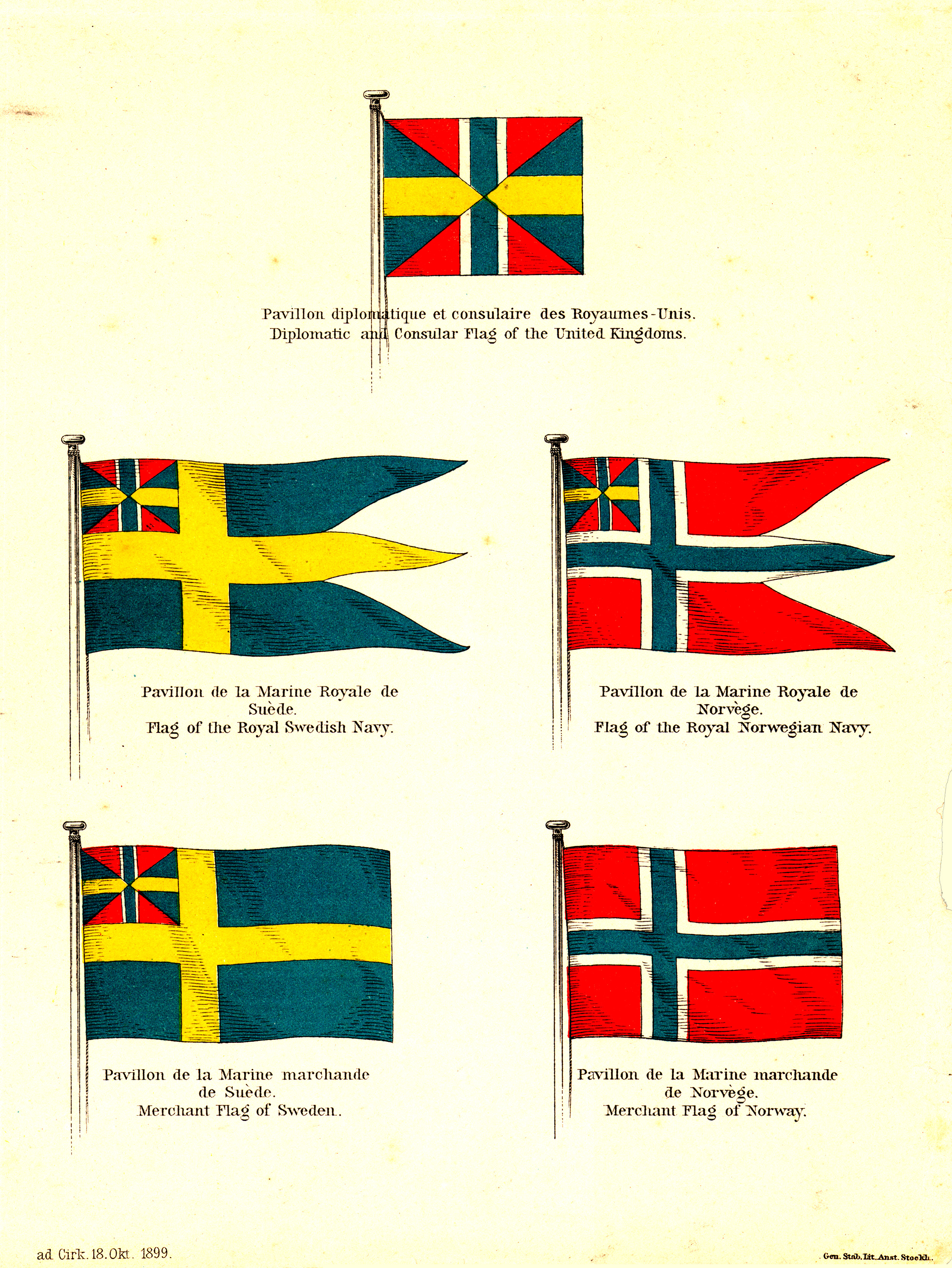 킬 조약 직후, 스웨덴은 더 큰 노르웨이 문장에 스웨덴 문장을 포함시켰다.[8] 노르웨이인들은 마치 노르웨이가 스웨덴의 필수적인 부분인 것처럼 스웨덴 동전과 정부 문서에도 이를 표시한 것에 대해 불쾌하게 생각했다.[8] 그들은 또한 1819년까지 노르웨이 동전에 새겨진 국왕의 칭호가 "스웨덴과 노르웨이의 국왕"이었다는 사실에 분개했다.[8] 이러한 모든 문제는 오스카르 1세가 1844년에 즉위한 후 해결되었다.[8] 그는 즉시 노르웨이 문제와 관련된 모든 문서에서 "노르웨이와 스웨덴의 국왕"이라는 칭호를 사용하기 시작했다.[8] 국기와 문장에 관한 공동 위원회의 제안은 양국에서 시행되었다.[8] 두 나라의 국기에 있는 정부에 두 나라의 국기 색상을 동등하게 배합한 연합 표식이 배치되었다.[8] 두 나라는 분리되었지만 병렬적인 국기 체계를 획득하여 평등함을 분명히 나타냈다.[8] 노르웨이인들은 이전의 공동 군기 및 해군 기가 분리된 국기로 대체된 것을 기뻐했다.[8] 노르웨이 문장은 스웨덴의 더 큰 문장에서 제거되었고, 공동 연합 및 왕실 문장은 왕가, 외교부, 그리고 양국과 관련된 문서에만 사용하도록 만들어졌다.[8] 연합 문장의 중요한 세부 사항은 두 개의 왕관이 방패 위에 놓여 두 개의 주권 왕국 간의 연합임을 보여준다는 것이다.[8]