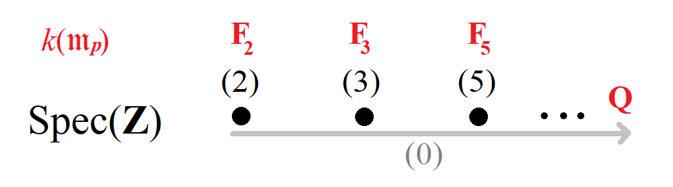 \mathfrak{m}=(p, f(x))에서의 잉여 필드는 k(\mathfrak{m})=\Z[x]/\mathfrak{m} = \mathbb{F}_p[x]/(f(x))\cong \mathbb{F}_{p}(\alpha)이며, f(x) 의 근 x=\alpha 를 추가하는 \mathbb{F}_p 의 필드 확장이다. 이는 p^d 개의 원소를 갖는 유한 필드이며, d=\operatorname{deg}(f) 이다. 다항식 r(x)\in\Z[x] 는 스킴 Y에서 값 r(\mathfrak{m}) = r \ \mathrm{mod}\ \mathfrak{m}을 갖는 함수에 해당하며, 즉 r(\mathfrak{m}) = r(\alpha)\in \mathbb{F}_p(\alpha) 이다. 다시 말해 각 r(x)\in\Z[x] 는 닫힌 점에서의 값 r(\mathfrak{m})에 의해 결정된다. V(p)는 상수 다항식 r(x)=p의 소멸 궤적이며, V(f(x))는 대수적 폐포 \overline{\mathbb{F}}_p에서 f(x)의 근의 갈루아 궤도에 해당하는 각 특성 p 의 점을 포함한다.