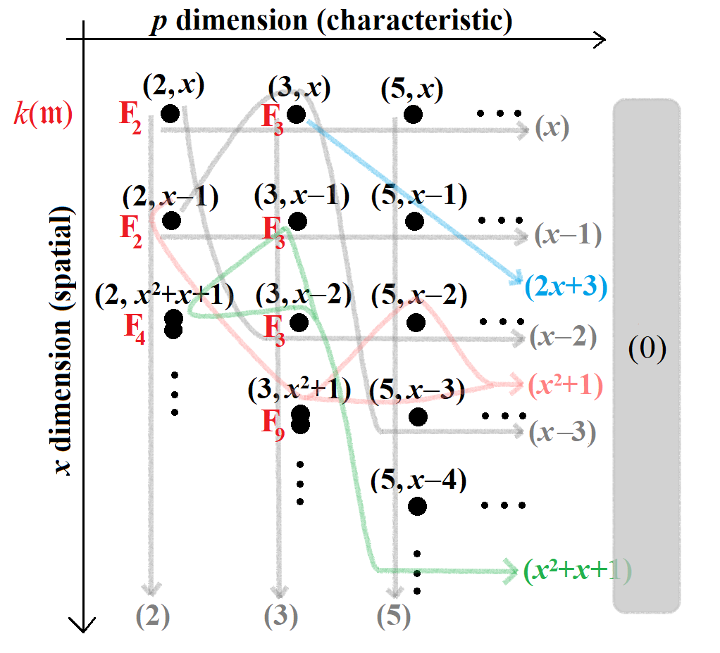 V(x^2+1) 과 같은 고차 "수평" 부분 스킴은 x^2+1 의 근인 x-값, 즉 x=\pm \sqrt{-1} 에 해당한다. 이는 서로 다른 p -좌표에서 다르게 동작한다. p=5에서 x=\pm 2\ \text{mod}\ 5 의 두 점을 얻는데, 이는 (5,x^2+1)=(5,x-2)\cap(5,x+2) 이기 때문이다. p=2에서 한 개의 분기된 이중점 x=1\ \text{mod}\ 2 을 얻는데, 이는 (2,x^2+1)=(2,(x-1)^2) 이기 때문이다. 그리고 p=3에서 \mathfrak{m}=(3, x^2+1)\mathbb{F}_3 의 확장 필드에서 x=\pm \sqrt{-1} 에 해당하는 소 아이디얼이다. 이러한 값들을 구별할 수 없으므로(갈루아 군에 대해 대칭이므로), V(3, x^2+1)을 두 개의 융합된 점으로 묘사해야 한다. 전반적으로, V(x^2+1) 은 두 개의 갈루아 대칭 수평선의 일종의 융합이며, 차수가 2인 곡선이다.