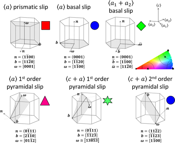 회절 방법은 일반적으로 잔류 전위의 슬립면을 해결할 수 없다. 예를 들어, Zr에서 ⟨a⟩/〈𝑎〉영어 전위의 나사 성분은 프리즘, 기저 또는 1차 피라미드면에서 슬립될 수 있다. 마찬가지로 ⟨c + a⟩/〈𝑐 + 𝑎〉영어 나사 전위는 1차 또는 2차 피라미드면에서 슬립될 수 있다.[5]