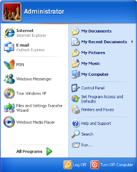 윈도우 XP에서 시작 메뉴는 크게 변경되었다. 두 개의 열로 확장되었는데, 왼쪽 열에는 최근에 사용한 프로그램 목록이 표시되었다. 오른쪽 열에는 내 문서, 내 그림, 내 음악과 같은 특수 폴더와 내 컴퓨터, 네트워크(윈도우 95 및 98에서는 "내 네트워크 환경") 등의 항목이 있었다.[5]