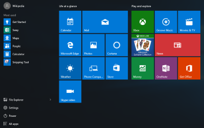 윈도우 10에서는 수정된 형태의 시작 메뉴를 다시 도입했다. 윈도우 7 버전과 유사한 두 열 디자인을 사용하지만, 오른쪽 열에는 윈도우 8의 시작 화면과 마찬가지로 타일이 채워진다. 응용 프로그램을 오른쪽 절반에 고정할 수 있으며, 해당 타일의 크기를 조정하고 사용자 지정 범주로 그룹화할 수 있다. 왼쪽 열에는 자주 사용하는 응용 프로그램과 "모든 앱" 메뉴, 파일 탐색기, 설정 및 전원 옵션에 대한 링크가 포함된 세로 목록이 표시된다. 다운로드, 사진, 음악과 같은 폴더에 대한 링크를 비롯한 일부 링크는 설정의 "시작에 표시할 폴더 선택" 페이지를 통해 추가할 수 있다. 시작 메뉴의 크기를 조정하거나 전체 화면으로 표시할 수 있다(가로 대신 세로 스크롤).[8][9] "태블릿 모드"가 활성화되면 시작 메뉴도 이 상태가 된다.[10][11][12][13]