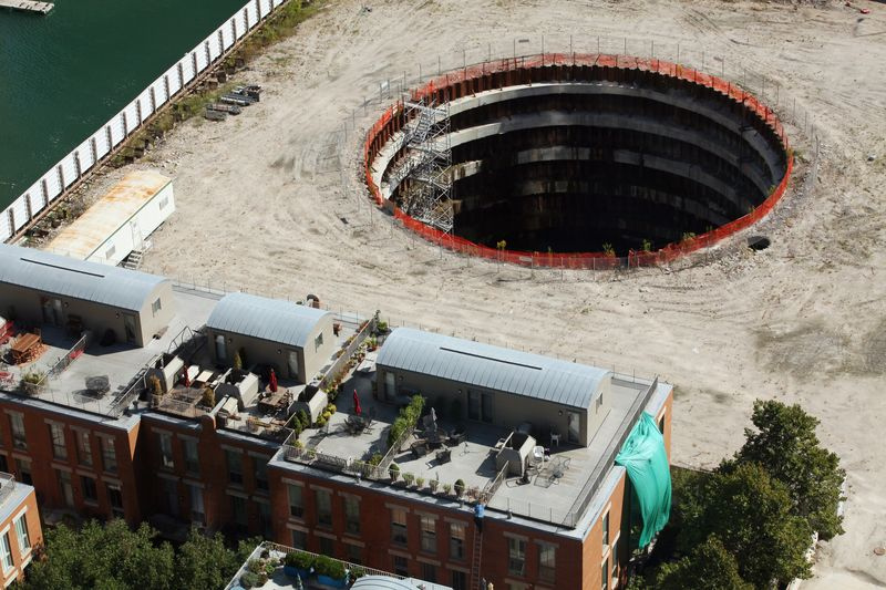2008년 9월 19일, 개발업체 대변인은 건물 건설이 계속 진행되고 있지만, 서브프라임 모기지 사태로 인한 금융 시장 회복을 기다리며 건설 속도를 늦출 것이라고 발표했다.[75] 켈러허(Kelleher)는 여전히 재정적 지원을 받고 있다고 약속했지만,[75] 분석가들은 현재의 경제 침체에서 이 프로젝트가 살아남을 수 있을지에 대해 의문을 제기했다.[76] 건물의 상부 구조 건설 계약자는 아직 지정되지 않았다.[76] 2008년 10월 1일 ''월스트리트 저널''은 건물 기초 공사가 완료되었으며, 시장이 회복될 때까지 지상 건설은 계속되지 않을 것이라고 보도했다.[77]