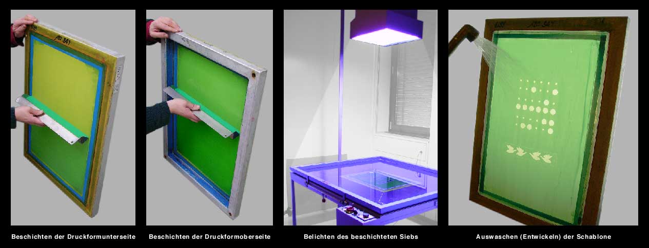 - 사진 제판법: 빛에 반응하는 감광 유제를 사용하여 스크린에 이미지를 형성하는 방법이다. 20세기 초부터 사용되었으며, 자세한 제작 과정은 하위 섹션에서 다룬다.