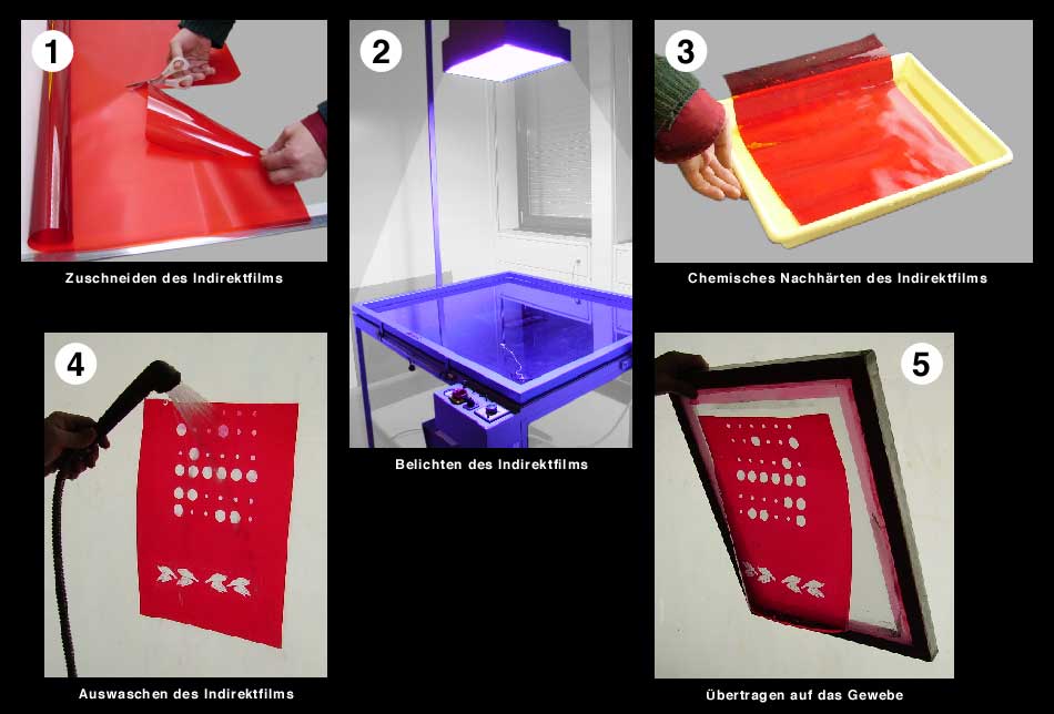 간접법에서는 빛이 닿으면 굳어져 메쉬에 정착하는 성질을 가진 감광재를 바른 감광성 필름을 사용한다. 틀에 메쉬를 씌우지 않고 감광성 필름에 원본을 맞춰 노광하여 빛이 닿지 않은 부분만 제거하고, 감광제를 감광성 필름 위에서 메쉬로 옮긴다.[1]직접법과 비교하면 유제의 윤곽 부분을 이상적인 형태로 마무리하기가 더 쉽다. 인쇄 대상물에 잉크 윤곽의 번짐과 같은 현상이 보이는 것은 직접법보다 적다.[1]