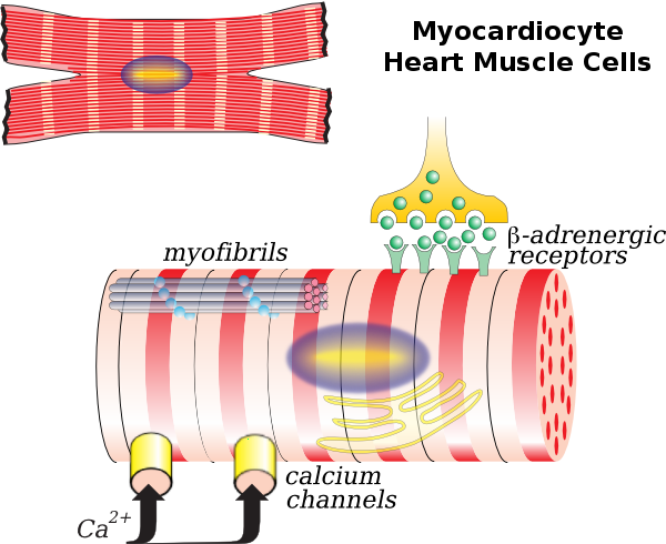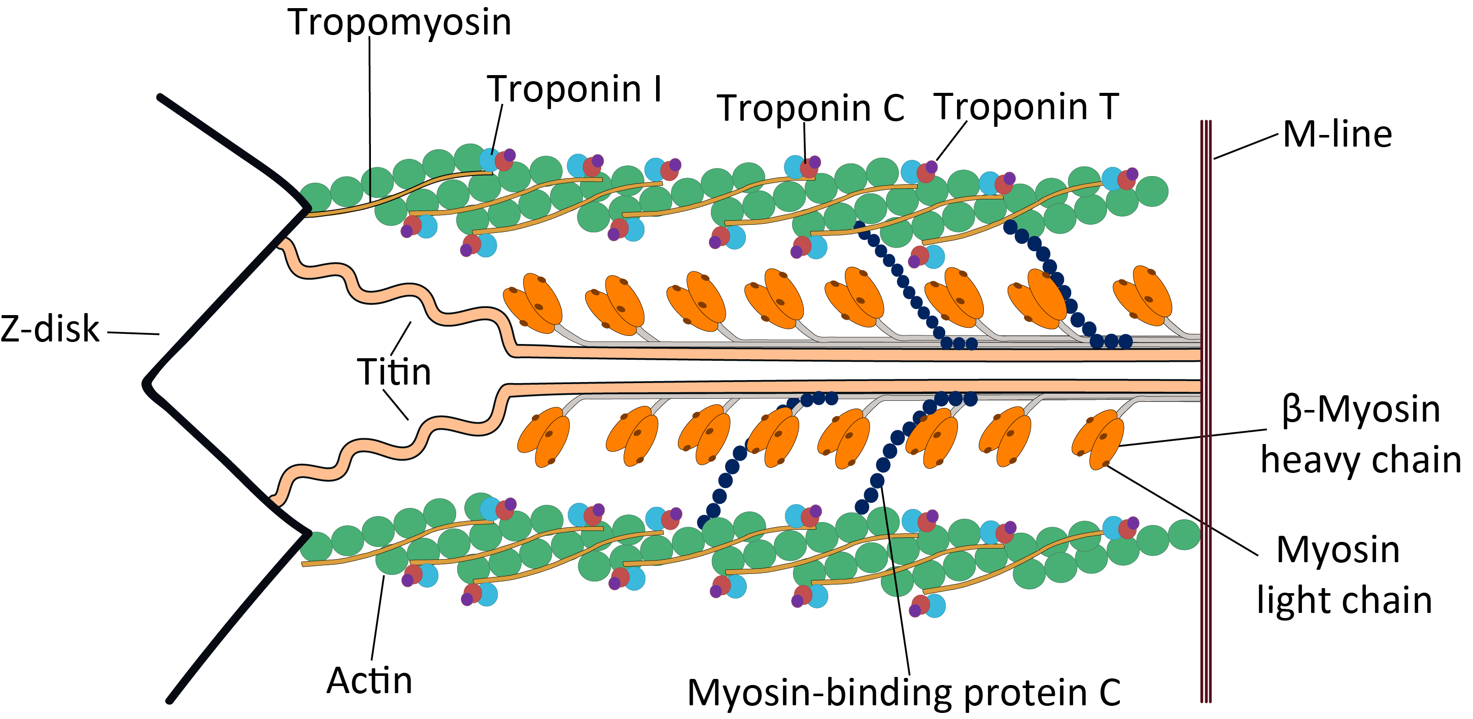 심장 근육 세포의 수축 동안, 세포 길이를 따라 정렬된 긴 단백질인 근세사는 미끄러지는 필라멘트 이론으로 알려진 현상으로 서로 미끄러진다. 근세사에는 단백질 미오신으로 구성된 굵은 필라멘트와 단백질 액틴, 트로포닌, 트로포미오신으로 구성된 얇은 필라멘트가 있다. 굵은 필라멘트와 얇은 필라멘트가 서로 지나가면서 세포는 짧아지고 굵어진다. 교차 브리지 사이클 메커니즘에서 칼슘 이온은 트로포닌에 결합하고, 트로포닌은 트로포미오신과 함께 액틴의 주요 결합 부위를 덮는다. 굵은 필라멘트의 미오신은 액틴에 결합하여 굵은 필라멘트를 얇은 필라멘트를 따라 당길 수 있다. 세포 내 칼슘 농도가 감소하면 트로포닌과 트로포미오신이 다시 액틴의 결합 부위를 덮어 세포가 이완된다.