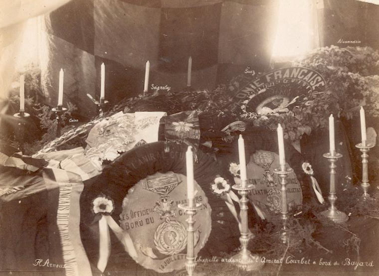 6월 23일, ''바야르'' 호는 30척이 넘는 프랑스 군함의 19발의 예포를 받으며 마궁을 떠나 쿠르베의 시신을 파리에서 국장으로 치르기 위해 프랑스로 가져갔다. 싱가포르, 마헤(세이셸), 아덴, 수에즈, 알렉산드리아, 보네 등에서 정차하는 두 달간의 프랑스 귀국 항해 끝에 ''바야르'' 호는 8월 24일 프로방스 해안에 도착하여 레 살랭 디에르 항구에서 프랑스 지중해 함대에 합류했다. 쿠르베의 관은 8월 26일 의식적으로 육지에 내려져 특별 열차를 타고 파리로 옮겨졌다. 아비뇽과 파리행 경로의 다른 역에서 애국심 넘치는 군중들이 프랑스에서 가장 유명한 제독에게 마지막 경의를 표하기 위해 길을 따라 늘어섰다. 쿠르베의 국장은 8월 27일 레쟁발리드에서 거행되었다. 장례 연설은 앙제 주교이자 통킹에서 쥘 페리의 식민지 정복 정책의 가장 열렬한 지지자 중 한 명인 샤를 에밀 프레펠이 낭독했다. 쿠르베의 시신은 기차로 고향인 피카르디의 아베빌로 옮겨졌고, 9월 1일 장례식이 거행되었다. 프레펠 주교의 추가 연설에 이어, 최근 임명된 해군 장관인 샤를-외젠 갈리베르 제독이 아베빌의 생 불프랑 대학 교회에서 쿠르베에 대한 마지막 찬사를 전했다.[11]