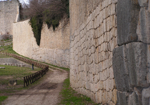이 성벽의 30m 구간은 2006년에 무너져 현재 수리 중이다. 성벽은 로마 시대와 중세 시대에 여러 차례에 걸쳐 보강되고 확장되었다.[5] 성벽의 전체 길이는 약 720m, 두께는 약 3.5m이며, 4개의 주요 관문이 있다. 남쪽에 있는 도시의 주요 출입구인 인상적인 포르타 로마나(Porta Romana), 북쪽의 포스테롤라(Posterola), 동쪽의 포르타 레오네(Porta Leone), 서쪽의 포르타 델라 발레(Porta della Valle)가 그것이다.
