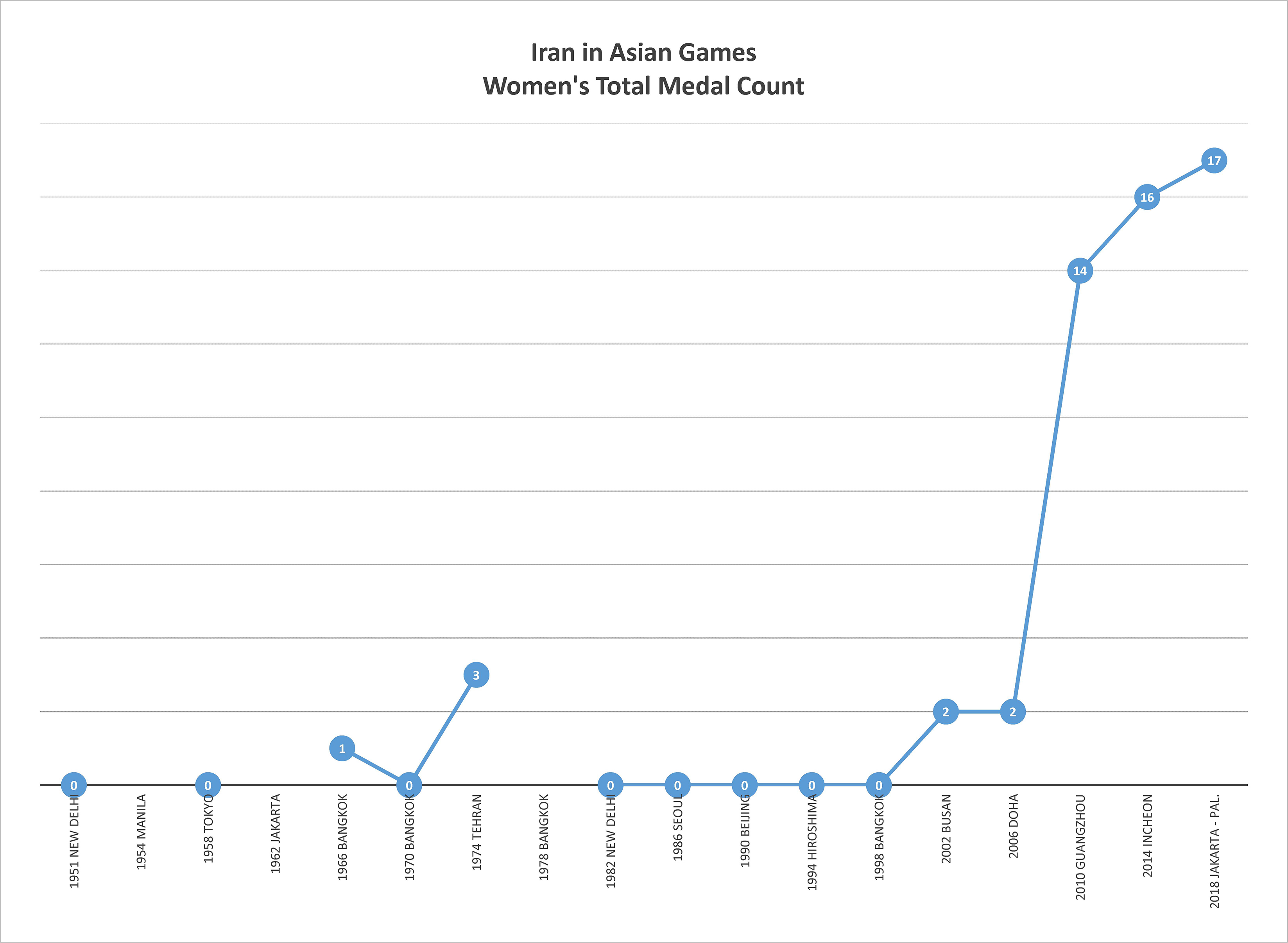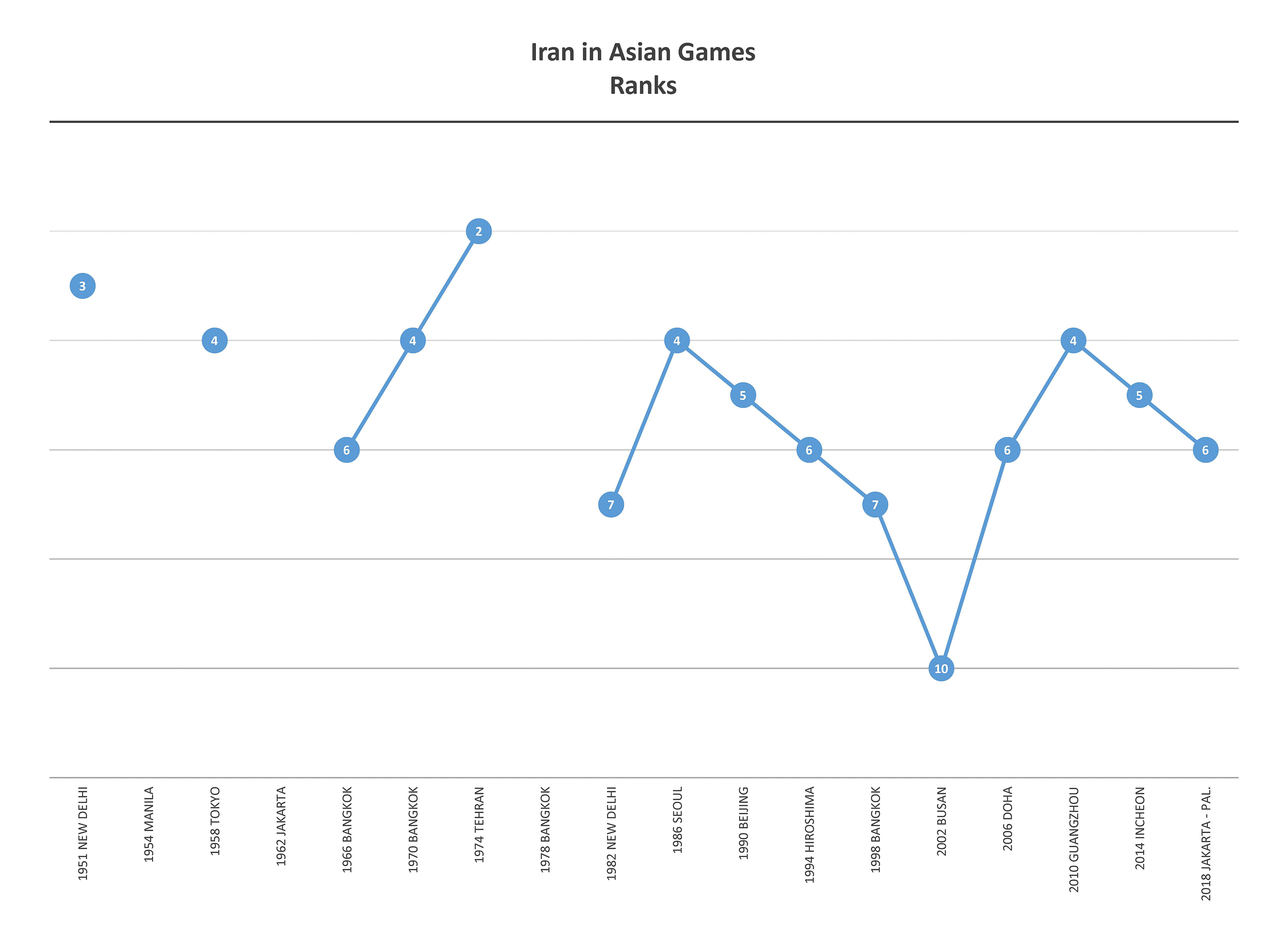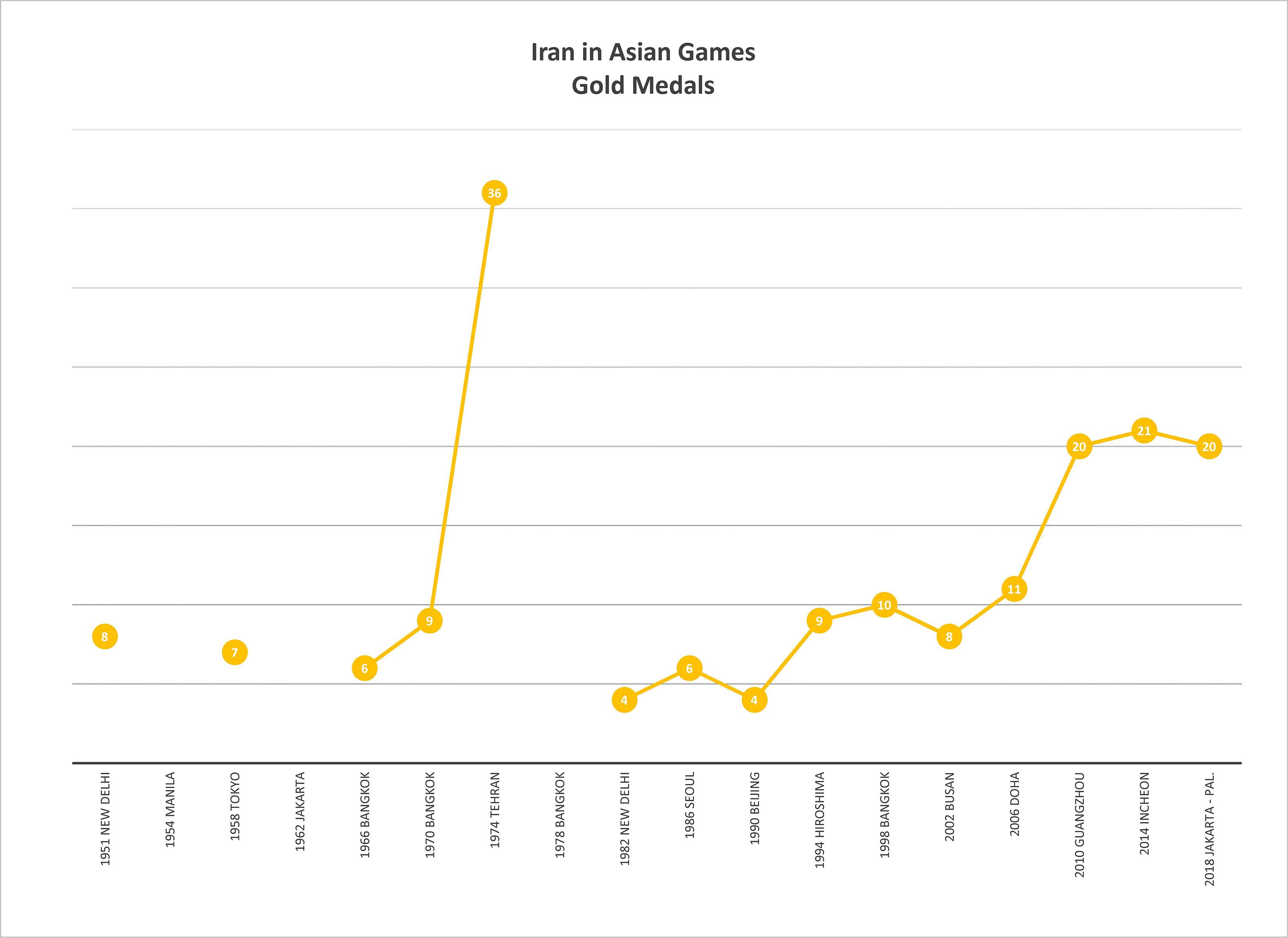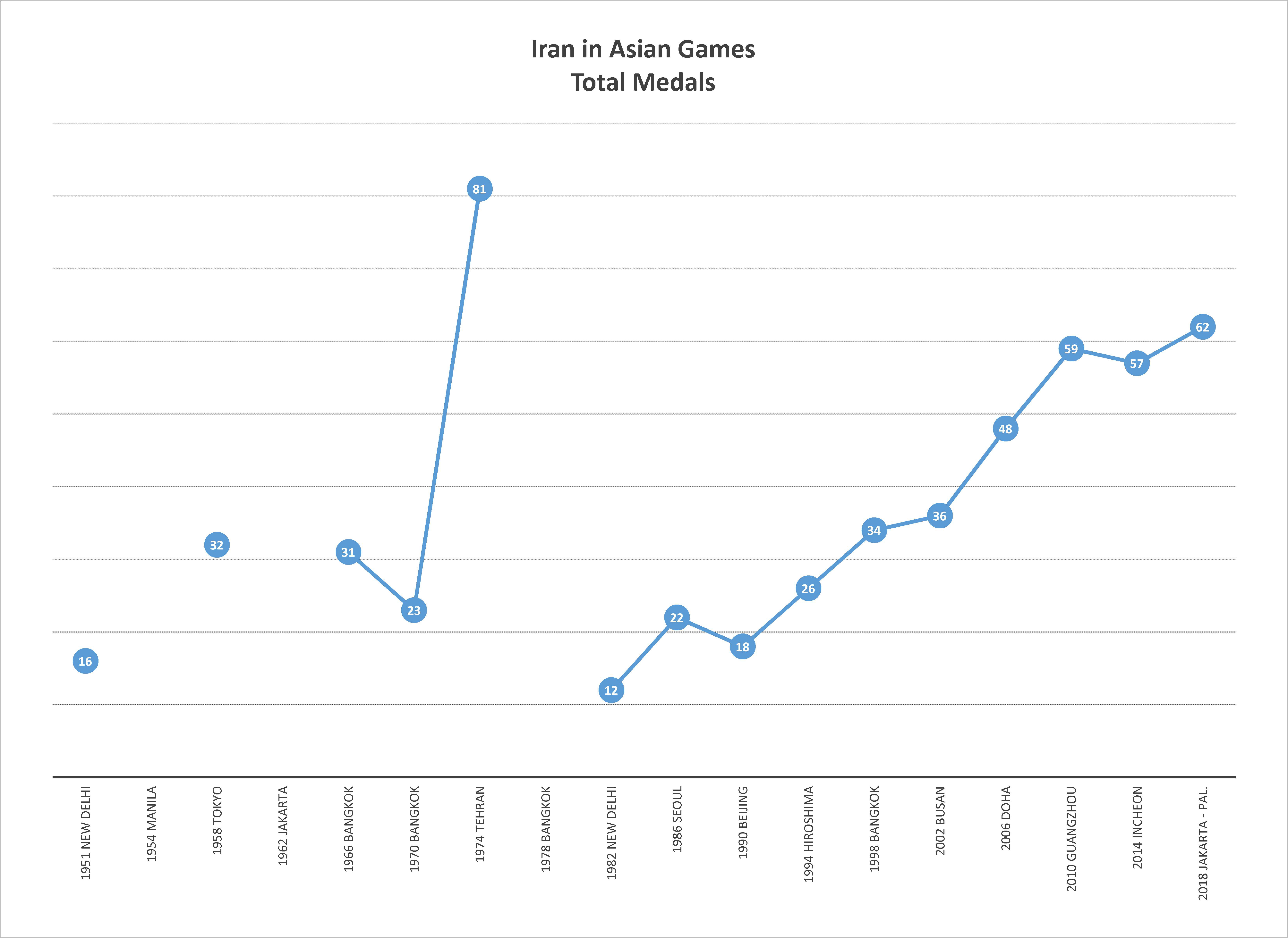 이란은 1951년 뉴델리에서 열린 제1회 아시안 게임부터 참가하기 시작했다. 이후 1954년 마닐라, 1962년 자카르타, 1978년 방콕 대회에는 불참했으나, 나머지 대회에는 꾸준히 선수단을 파견했다. 특히 1974년 아시안 게임은 수도 테헤란에서 개최하였으며, 이 대회에서 금메달 36개, 은메달 28개, 동메달 17개로 총 81개의 메달을 획득하며 일본에 이어 종합 2위라는 역대 최고 성적을 거두었다.