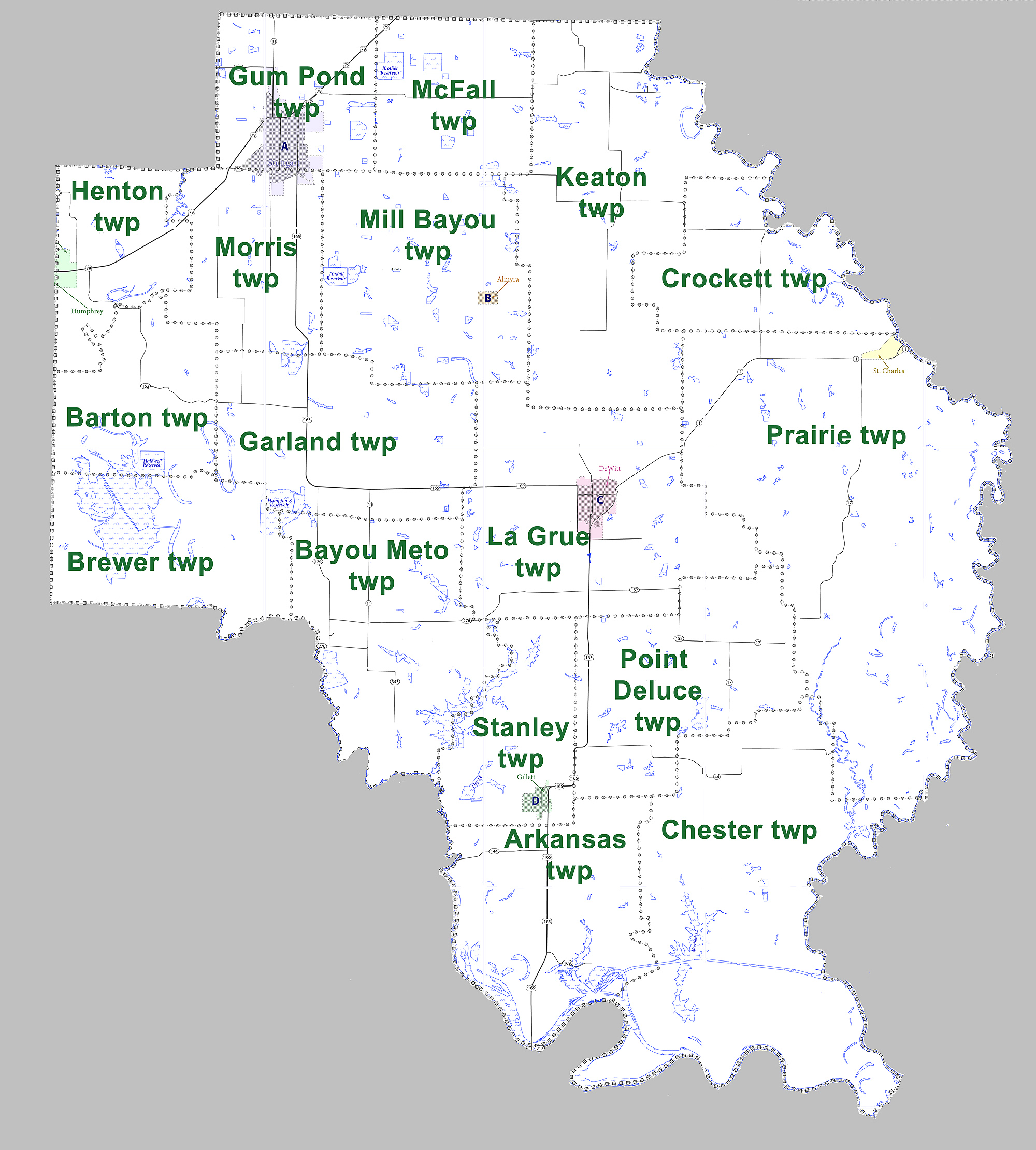 델타 내에서 아칸소 군은 거의 전적으로 그랜드 프레리 하위 지역에 속하며, 역사적으로 불투수성 점토층(슈투트가르트 토양군)이 있는 평평한 초원 평야였다. 19세기 이전에는 투과성이 느리거나 매우 느린 토양(종종 프래지팬을 포함)을 가진 더 평평한 지역이 아칸소에서 가장 큰 초원을 지원했으며, 초원 잔디와 풀로 덮여 있었고, 낮은 언덕과 능선은 참나무로 덮여 있었으며, 저지대 경엽수림이 있는 범람원도 있었다. 이 지역은 한때 미시시피 범람원의 다른 부분을 지배했던 저지대 숲과는 뚜렷한 대조를 이루었다. 현재는 농지가 주로 원생 식생을 대체했다. 특히 쌀이 주요 작물이며, 콩, 목화, 옥수수, 밀도 재배된다. 쌀 농장은 많은 수의 다양한 종의 물새에게 서식지와 먹이를 제공하며, 미시시피 플라이웨이를 따라 이 중요한 지점에서 오리 및 거위 사냥이 이루어진다.[15]