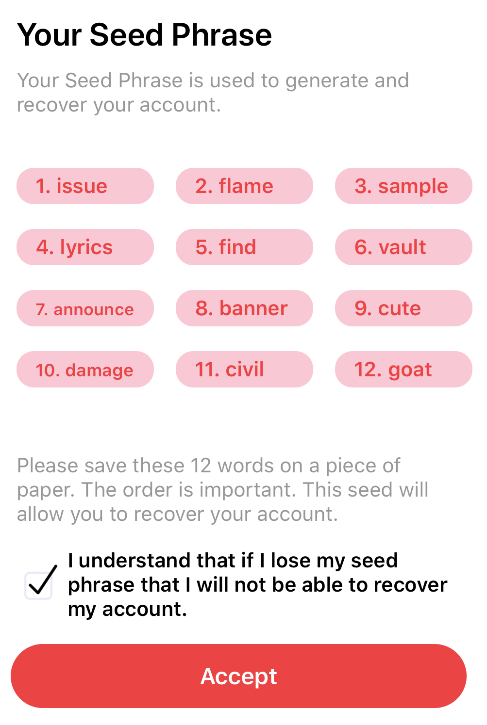 지갑을 처음 사용할 때는 난수에 의해 시드 구문이 만들어진다. 하드웨어 지갑(콜드 지갑이라고도 함)이나 때로는 온라인 지갑에서도 시드 구문을 기록하는 것이 권장된다. 만약 지갑이 분실, 손상 등의 위험에 노출된 경우, 시드 구문을 사용하여 앞서 사용하던 지갑과 관련된 키 및 암호화폐 전체에 다시 접근할 수 있다.[58] 또한, 코인 종류마다 주소 생성 알고리즘은 다르지만, 많은 지갑은 하나의 시드 구문에서 다양한 종류의 주소 생성에 대응하고 있다.