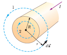 예를 들어, 무한히 긴 직선 도선에 전류를 흘리면, 전류 주위에 동심원 모양으로 오른나사 방향의 자기장이 생긴다. 닫힌 경로로 반지름 r 의 동심원을 잡으면 그 위에서 자기장 세기는 같다.
