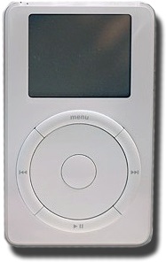 2001년 9월 23일 애플은 휴대용 음악 재생기인 아이팟을 발표했고 11월 10일에 정식 발매했다.[232][233] 곧이어 온라인 음악 판매 서비스인 아이튠즈 뮤직 스토어가 열렸고 아이팟과 연동되는 음악 파일들을 한곡당 99센트에 판매했다. 아이팟은 클릭휠방식의 사용자 인터페이스를 채용하여, 아이튠즈를 통해 음악과 기타 데이터들을 관리하고 동기화 시키는 제품이다.