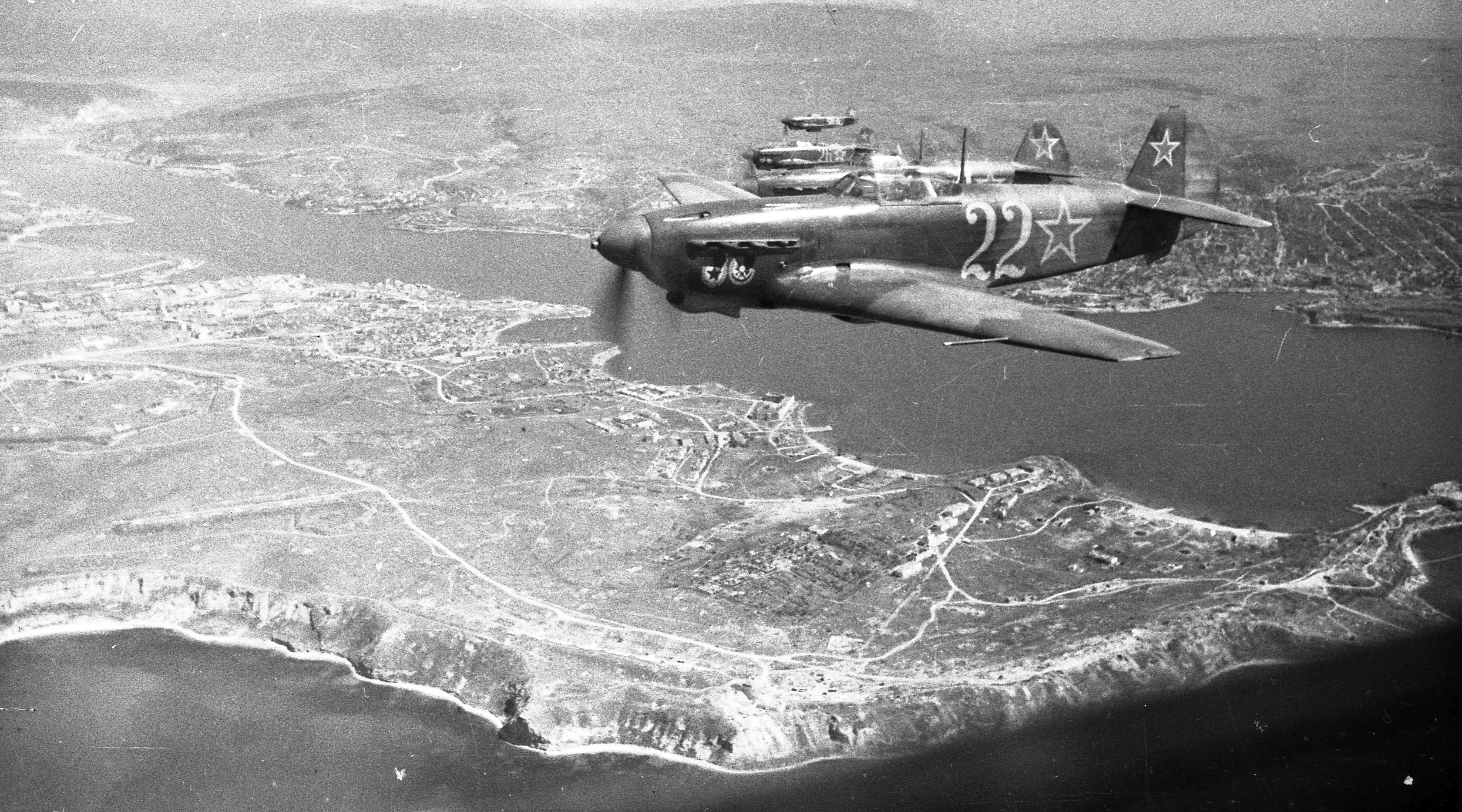 1944년 5월, 세바스토폴 상공을 비행하는 흑해 함대 공군의 제6근위 전투 항공 연대의 Yak-9D