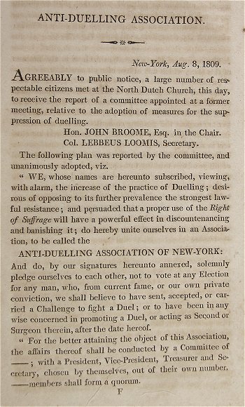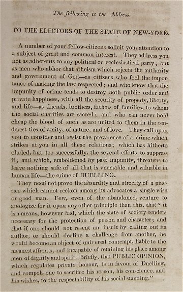 해밀턴의 죽음 이후, 미국 사회에서는 결투를 금지해야 한다는 여론이 높아졌고, 반(反) 결투 운동이 확산되었다. 엘리파렛 노트는 해밀턴의 장인인 필립 스카일러가 다니던 올버니 교회의 목사였는데, 그는 "알렉산더 해밀턴 장군의 영원히 애통스러운 죽음을 기리는, 올버니 시 북 더치 교회에서 행해진 담론, 1804년 7월 29일"을 설교했고, 이 설교는 곧 재발행되었다. 1806년, 라이먼 비처는 반결투 설교를 했고, 이 설교는 1809년 뉴욕 반결투 협회에서 재발행되었다.