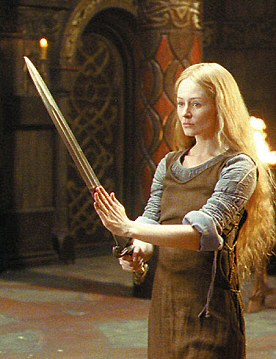 영문학자 헬렌 영은 톨킨과 잭슨 모두 에오윈에게 마법사왕을 죽인 공로에 대한 감사를 표하지 않았지만, 잭슨의 영화 버전에서는 적어도 19세기 화가 피터 니콜라이 아르보의 그림 ''헤르보르의 죽음''에 묘사된 성 역할을 뒤집었다고 적었다. 영화는 톨킨의 글에서 진정한 게르만 의식을 보여주는 여성이 평화를 짜는 것을 구현하는 에오윈의 술 따르는 역할을 축소했는데, 영은 이는 시나리오 작가들이 관객이 이 장면을 잘못 해석할까 봐 두려워했기 때문이라고 추측한다. 하지만 확장판 "에도라스로의 귀환" 장면에는 테오덴을 위한 의식이 포함되어 있다.[37]