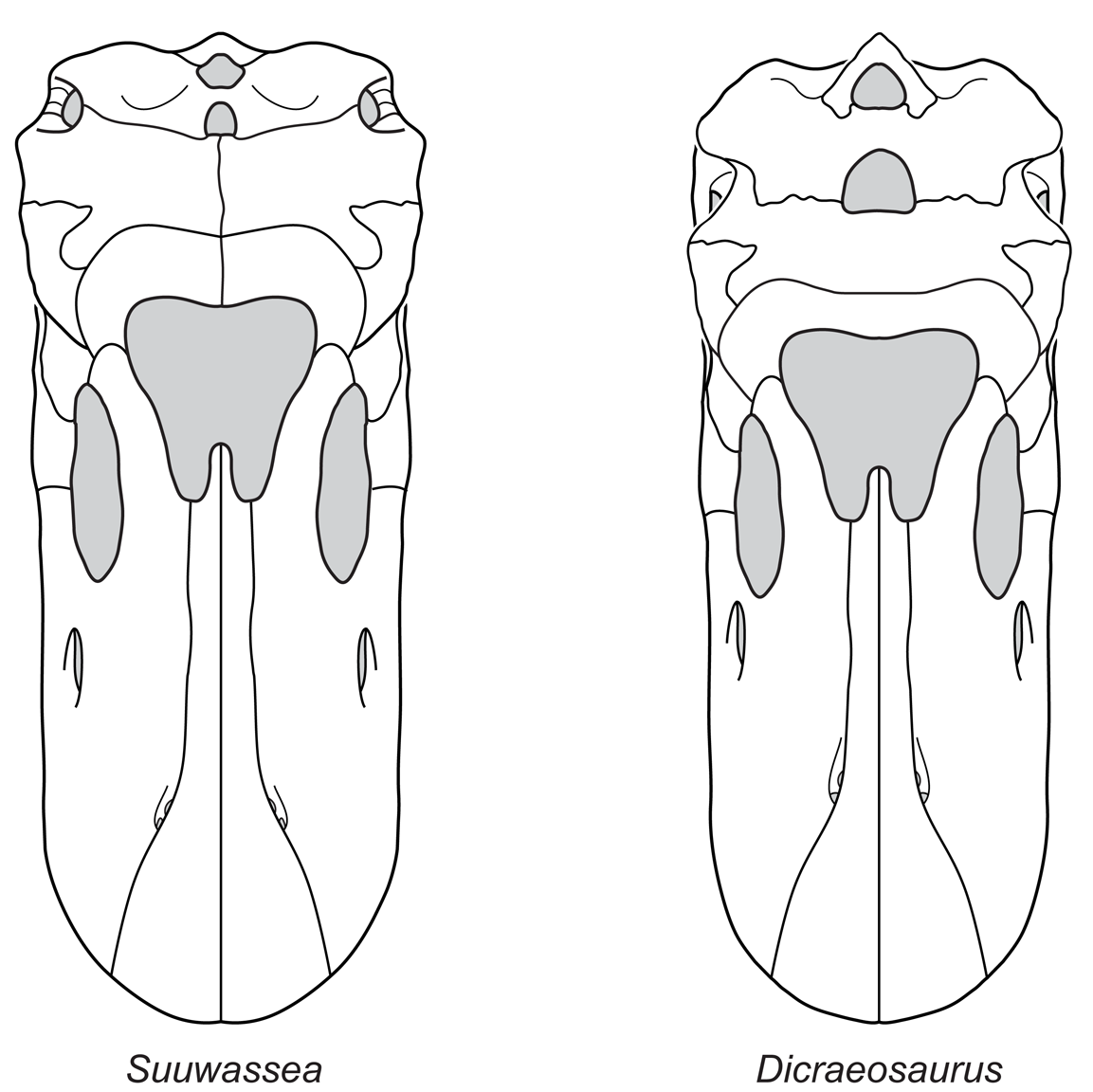 - 두정골에 디크라에오사우루스과 외에서는 드문 "후정수리창"이 있다.[21]