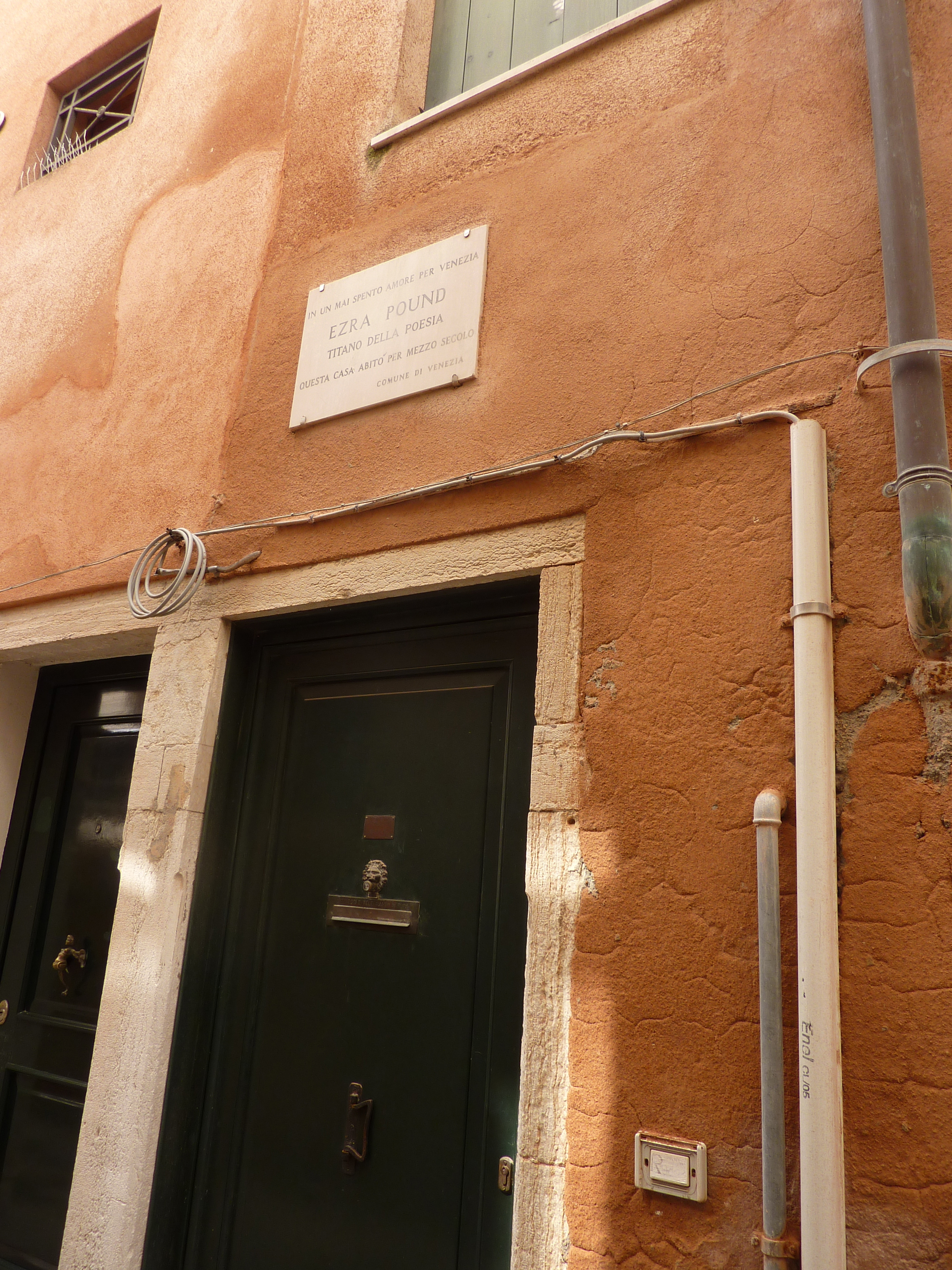 1928년 베네치아 칼레 케리니 252에 있는 올가 루지(Olga Rudge)의 집. 명판에는 다음과 같이 쓰여 있다: "베네치아를 끊임없이 사랑하며, 시의 거장 에즈라 파운드는 50년 동안 이 집에 살았다."