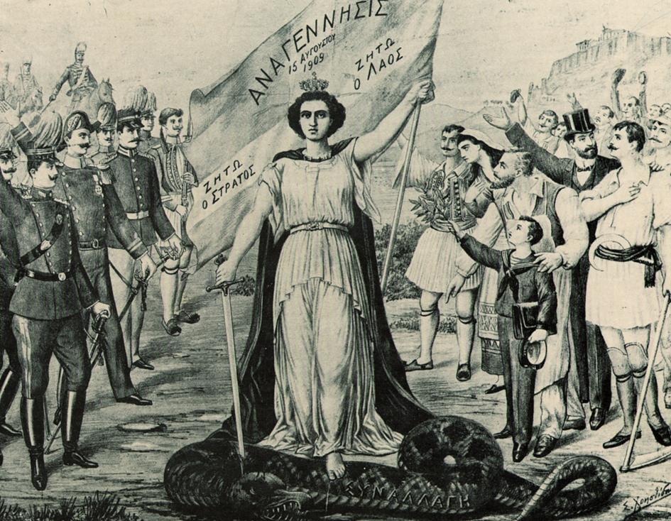 1909년 그리스 왕국에서 군 장교들에 의한 쿠데타가 발생하자, 크레타 섬에서의 정치적 수완을 인정받은 베니젤로스는 그리스 정부에 의해 아테네로 초청받았다.[125] 총선 실시를 주장한 그의 제안은 받아들여졌고, 1910년 8월 8일과 11월 28일에 두 차례에 걸쳐 총선이 실시되었다. 8월 선거에서는 베니젤로스가 출마하지 않았지만 총리로 임명되었다. 그러나 다수파를 차지하지 못해 사임했고, 11월 선거에 출마하여 362석 중 300석을 차지하며 다시 총리로 임명되었다.[128][129]