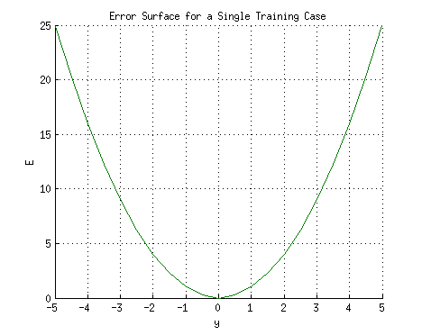여기서 는 불일치 또는 오차이다. 단일 훈련 사례 에 대한 네트워크를 생각해 보면, 입력 과 는 각각 1과 1이고 올바른 출력 는 0이다. 네트워크의 출력 를 수평 축에, 오차 를 수직 축에 표시하면 결과는 포물선이 된다. 이 포물선의 최소값은 오차 를 최소화하는 출력 에 해당한다. 단일 훈련 사례의 경우 최소값은 수평 축에도 닿으며, 이는 오차가 0이 되고 네트워크가 목표 출력 와 정확히 일치하는 출력을 생성할 수 있음을 의미한다.